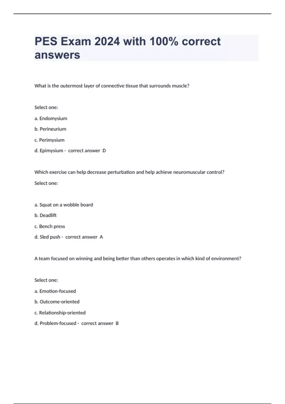 What is the outermost layer of connective tissue that surrounds muscle? Select one: a. Endomysium b. Perineurium c. Perimysium d. Epimysium - correct answer D Which exercise can help decrease perturbation and help achieve neuromuscular control? Select one: a. Squat on a wobble board b. Deadlift c. Bench press d. Sled push - correct answer A A team focused on winning and being better than others operates in which kind of environment? Select one: a. Emotion-focused b. Outcome-oriented c. Relationship-oriented d. Problem-focused - correct answer B A coach focused on initiating structure and accomplishing a set of objectives and goals is using which type of leadership style? Select one: a. Relationship-oriented b. Problem-focused c. Emotion-focu