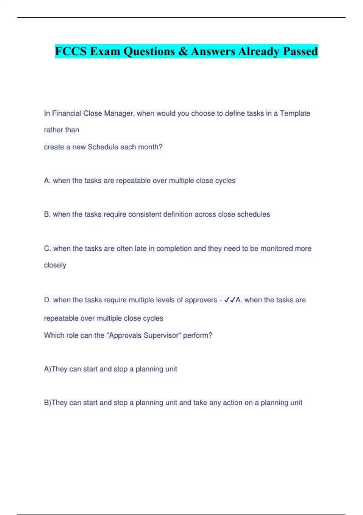 In Financial Close Manager, when would you choose to define tasks in a Template rather than create a new Schedule each month? A. when the tasks are repeatable over multiple close cycles B. when the tasks require consistent definition across close schedules C. when the tasks are often late in completion and they need to be monitored more closely D. when the tasks require multiple levels of approvers - ️️A. when the tasks are repeatable over multiple close cycles Which role can the "Approvals Supervisor" perform? A)They can start and stop a planning unit