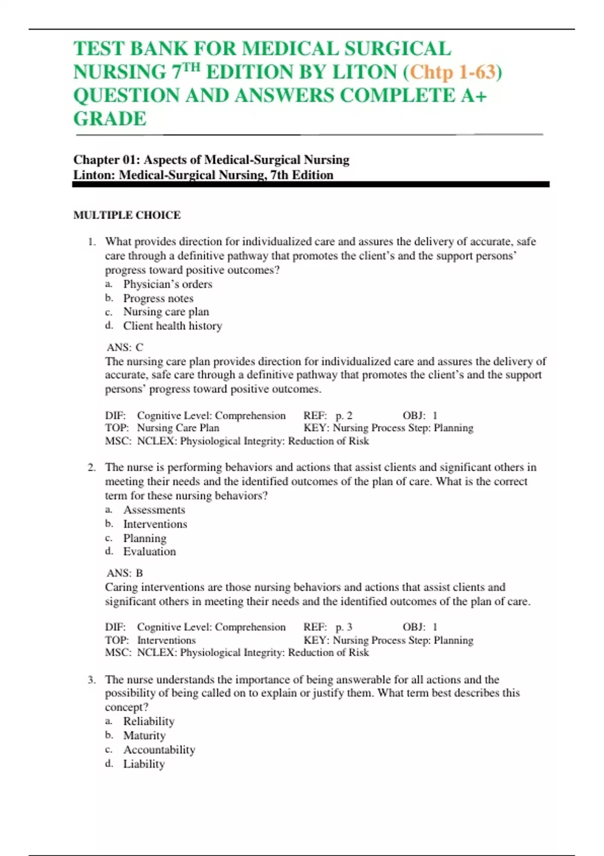 TEST BANK FOR MEDICAL SURGICAL NURSING 7TH EDITION BY LITON (Chtp 1-63) QUESTION AND ANSWERS COMPLETE A+ GRADE What provides direction for individualized care and assures the delivery of accurate, safe care through a definitive pathway that promotes the client’s and the support persons’ progress toward positive outcomes? The nurse is performing behaviors and actions that assist clients and significant others in meeting their needs and the identified outcomes of the plan of care. What is the correct term for these nursing behaviors?