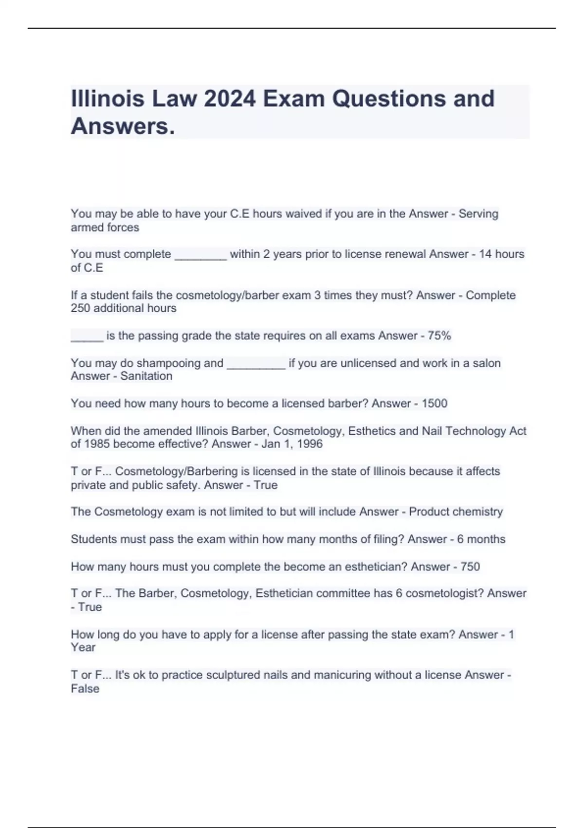 Illinois Law 2024 Exam Questions and Answers.