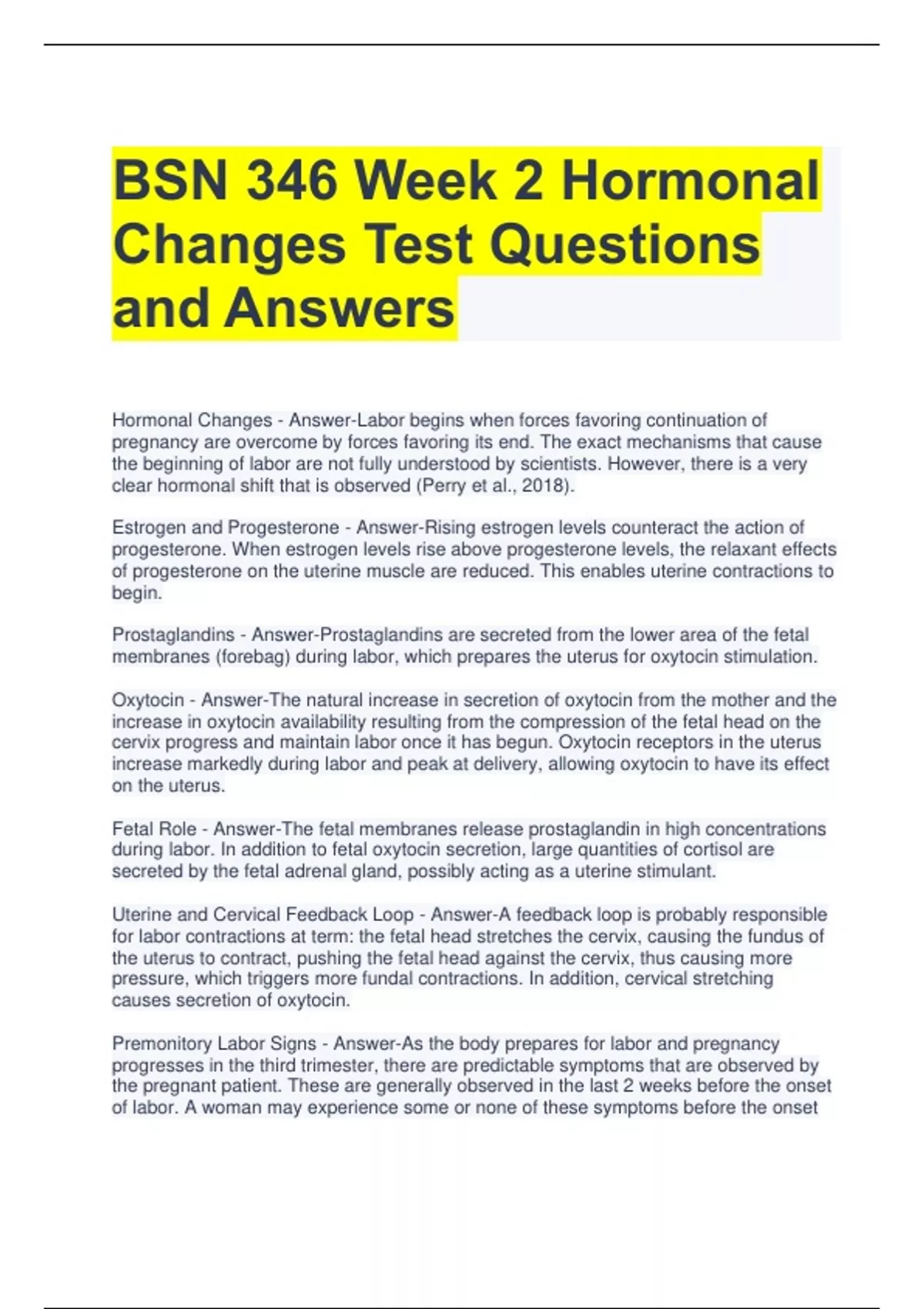 BSN 346 Week 2 Hormonal Changes Test Questions and Answers Hormonal Changes - Answer-Labor begins when forces favoring continuation of pregnancy are overcome by forces favoring its end. The exact mechanisms that cause the beginning of labor are not fully understood by scientists. However, there is a very clear hormonal shift that is observed (Perry et al., 2018). Estrogen and Progesterone - Answer-Rising estrogen levels counteract the action of progesterone. When estrogen levels rise above progesterone levels, the relaxant effects of progesterone on the uterine muscle are reduced. This enables uterine contractions to begin. Prostaglandins - Answer-Prostaglandins are secreted from the lower area of the fetal membranes (forebag) during labor, which prepares the uterus for oxytocin stimulation. Oxytocin - Answer-The natural increase in secretion of oxytocin from the mother and the increase in oxytocin availability resulting from the compression of the fetal head on the cervix progress and maintain labor once it has begun. Oxytocin receptors in the uterus increase markedly during labor and peak at delivery, allowing oxytocin to have its effect on the uterus. Fetal Role - Answer-The fetal membranes release prostaglandin in high concentrations during labor. In addition to fetal oxytocin secretion, large quantities of cortisol are secreted by the fetal adrenal gland, possibly acting as a uterine stimulant. Uterine and Cervical Feedback Loop - Answer-A feedback loop is probably responsible for labor contractions at term: the fetal head stretches the cervix, causing the fundus of the uterus to contract, pushing the fetal head against the cervix, thus causing more pressure, which triggers more fundal contractions. In addition, cervical stretching causes secretion of oxytocin. Premonitory Labor Signs - Answer-As the body prepares for labor and pregnancy progresses in the third trimester, there are predictable symptoms that are observed by the pregnant patient. These are generally observed in the last 2 weeks before the onset of labor. A woman may experience some or none of these symptoms before the onset of labor. Premonitory signs (signs of impending labor) are often noticed by women when the onset of labor is near. Further information about these signs is presented here. Braxton Hicks Contractions - Answer-Irregular mild contractions that do not cause effacement or dilatation of the cervix are known as Braxton Hicks contractions. Lightening (Dropping) - Answer-Lightening can occur several weeks before the onset of labor. The fetus descends toward the pelvic inlet, creating a "light" sensation when breathing. It is important to note that in primigravidas (first pregnancies), this sensation is usually felt more strongly than in multigravidas (patients that have delivered more than one baby). In multigravidas, the feeling of the baby dropping into the pelvis may not happen until labor begins (Perry et al., 2018)