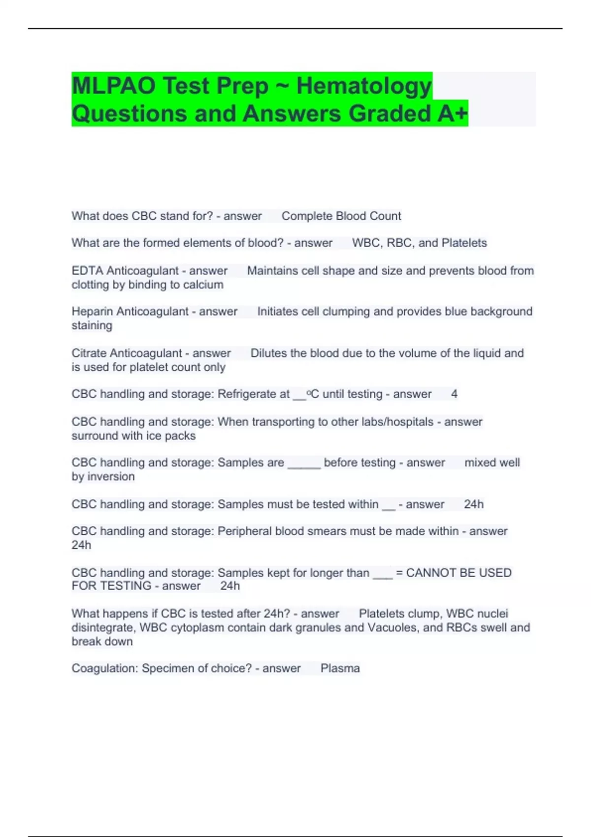 MLPAO Test Prep ~ Hematology Questions and Answers Graded A+ What does CBC stand for? Complete Blood Count What are the formed elements of blood? WBC, RBC, and Platelets Brainpower Read More Previous Play Next Rewind 10 seconds Move forward 10 seconds Unmute 0:11 / 0:15 Full screen EDTA Anticoagulant Maintains cell shape and size and prevents blood from clotting by binding to calcium Heparin Anticoagulant Initiates cell clumping and provides blue background staining Citrate Anticoagulant Dilutes the blood due to the volume of the liquid and is used for platelet count only CBC handling and storage: Refrigerate at __ᵒC until testing 4 CBC handling and storage: When transporting to other labs/hospitals surround with ice packs CBC handling and storage: Samples are _____ before testing mixed well by inversion CBC handling and storage: Samples must be tested within __ 24h CBC handling and storage: Peripheral blood smears must be made within 24h CBC handling and storage: Samples kept for longer than ___ = CANNOT BE USED FOR TESTING 24h What happens if CBC is tested after 24h? Platelets clump, WBC nuclei disintegrate, WBC cytoplasm contain dark granules and Vacuoles, and RBCs swell and break down Coagulation: Specimen of choice? Plasma Coagulation: What colour tube? What is the additive? light blue, sodium citrate Sodium Citrate binds to ___ preventing ____ calcium, coagulation Sodium Citrate tube must be filled to the maximum draw capacity Coagulation: Document if patient on anticoagulant therapy or aspirin Handling and Storage of Coagulation samples: Preparation requirements Centrifuge and separate Handling and Storage of Coagulation samples: ____ plasma if not tested within ___ of arrival Freeze, 4h Coagulation samples: Some clotting factors are considered to be highly labile (destroyed at room temperature) What are the three methods of Peripheral blood smears (PBS)? Wedge method (manual), Spun method (automated slide spinner), and automated method (analyzer) Thickness of film: HEMOGLOBIN/HEMATOCRIT INCREASED = angle of the spreader slide ___ Decreased Sodium Citrate tubes should be drawn ___ except when blood cultures are ordered. First Thickness of film: HEMOGLOBIN/HEMATOCRIT DECREASED = angle of the spreader slide ___ Increased HCT Values: Male, Female 0.40-0.50, 0.35-0.59 Good blood film should be ___ to ___ the length of the slide 2/3, ¾ Good blood film should have a slightly ___ or ____ edge Rounded, feathered The angle of the spreader slide is approximately ___ degrees 35 The greater the angle of the spreader slide the ____ and _____ the film Shorter, Thicker The lower the angle of the spreader slide the ___ and ____ the film Longer and Thinner Blood film should be allowed to ____ ___ completely before staining procedures air dry Fixative found in stain is Methanol Slides are washed with buffer of pH ___ to develop colour on the slide 6.4 Stain is comprised of ____ and ____ dyes Basic, acidic What is the basic (cationic) dye? Methylene blue Methylene blue stains the ___ of the cell and the granules of _____ (____ in colour) Nucleus, basophils, blue-grey What is the acidic (anionic) dye? Eosin Eosin stains ___ and the granules of ____ (_____ in colour) Hemoglobin, eosinophils, red-orange Neutral cell components utilized ___ dye resulting in the stain to be ____ Both, Purple Manual staining procedure: Stain for approximately ___ 1-3m Manual staining procedures: Add ___ proportions of buffer equal Manual staining procedures: Allow slide to sit for at least ___ 3m What to do if slides are too blue? Decrease stain time, increase rinsing time, decrease buffer pH What to do if slides are too pink? Increase stain time, decrease rinsing time, increase buffer pH What may cause slides to have stain deposits? Dirty slide, stain solutions not filtered properly, stain dried up on slide. HCT stands for? Hematocrit Hematocrit is the volume of RBCs after centrifugation for ____ at ____ rpm 5m, 1200 HCT: Cells are typically ___% of blood volume 40-50 HCT: Must be centrifuged within ___ of collection 4h HCT Normal Values: Critical 0.20 and 0.60 HCT Normal Values: Infant 0.50-0.60 HCT Normal Values: Toddler 0.35-0.42 HCT Normal Values: Male 0.40-0.50 HCT Normal Values: Female 0.35-0.59 Optical light scatter is used in Blood cell differentials (counting) Optical light scatter: Forward angle light scatter measures Cell size and volume Optical light scatter: Side light scatter measures granularity and nuclear size Units: RBC count x10^12/L Units: WBC count x10^9/L Units: Platelet count x10^9/L Units: Reticulocytes Whole number
