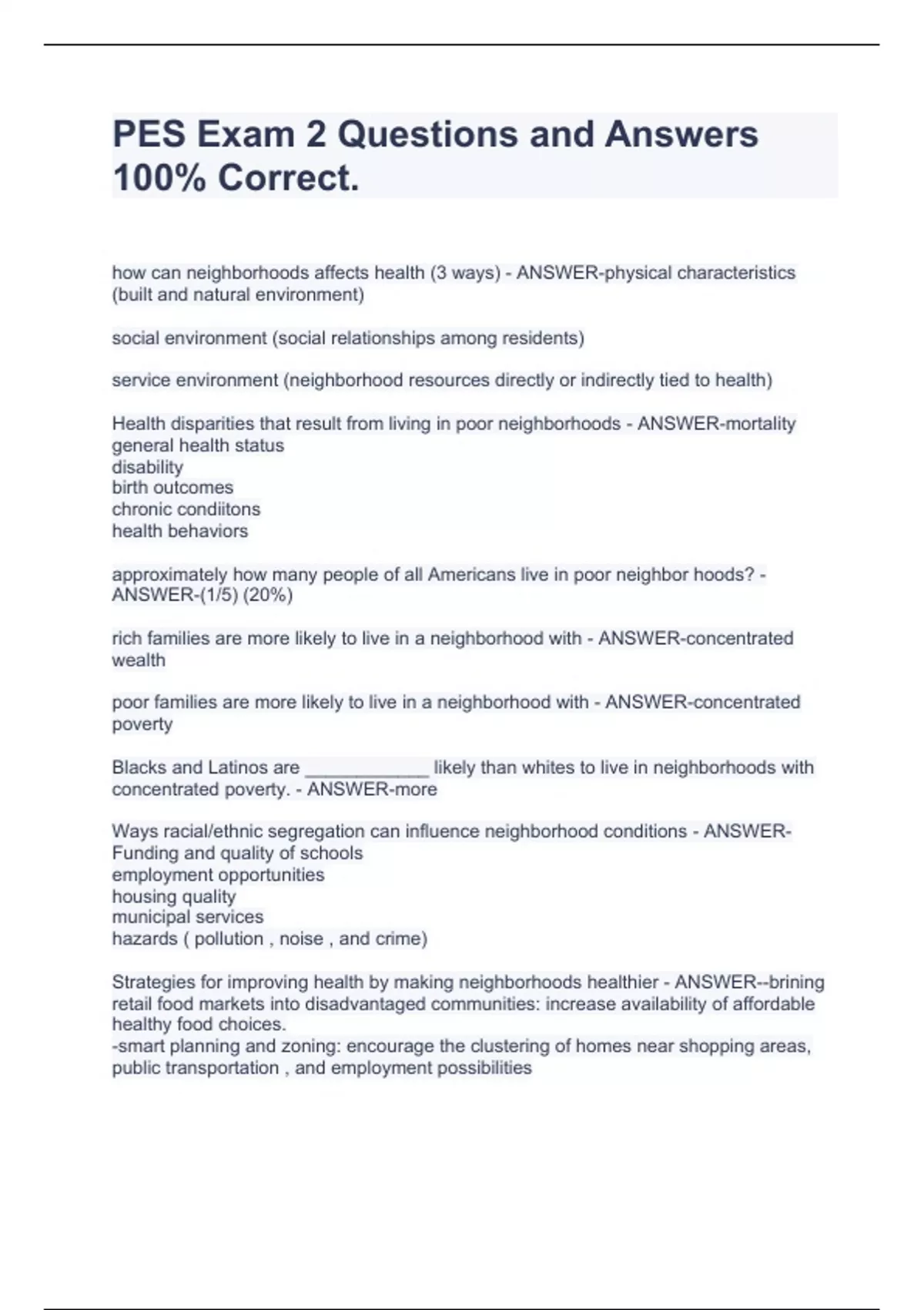 how can neighborhoods affects health (3 ways) - ANSWER-physical characteristics (built and natural environment) social environment (social relationships among residents) service environment (neighborhood resources directly or indirectly tied to health) Health disparities that result from living in poor neighborhoods - ANSWER-mortality general health status disability birth outcomes chronic condiitons health behaviors approximately how many people of all Americans live in poor neighbor hoods? - ANSWER-(1/5) (20%) rich families are more likely to live in a neighborhood with - ANSWER-concentrated wealth poor families are more likely to live in a neighborhood with - ANSWER-concentrated poverty Blacks and Latinos are ____________ likely than whites to live in neighborhoods with concentrated poverty. - ANSWER-more Ways racial/ethnic segregation can influence neighborhood conditions - ANSWER-Funding and quality of schools employment opportunities housing quality municipal services hazards ( pollution , noise , and crime) Strategies for improving health by making neighborhoods healthier - ANSWER--brining retail food markets into disadvantaged communities: increase availability of affordable healthy food choices. -smart planning and zoning: encourage the clustering of homes near shopping areas, public transportation , and employment possibilities -community revitalization: promote neighborhood economic development , which may improve the physical , social and service environments -reduce residential segregation: enforcement of fair housing laws, expansion of affordable housing supplies and zoning measures environmental justice - ANSWER-the fair treatment and meaningful involvement of all people regardless of race, color, national origin, or income with respect to the development, implementation, and enforcement of environmental laws, regulations, and policies. the physical environment - ANSWER-includes the "built environment" , the environment resulting from buildings and structures, along with the natural environment the social environment - ANSWER-includes the quality of relationships such as trust, connectedness and cooperation among neighborhood residents the service environment - ANSWER-includes neighborhood resources for education , employment, transportation , health care, grocery shopping , recreation and other services which come together to create vastly different opportunities to be healthy