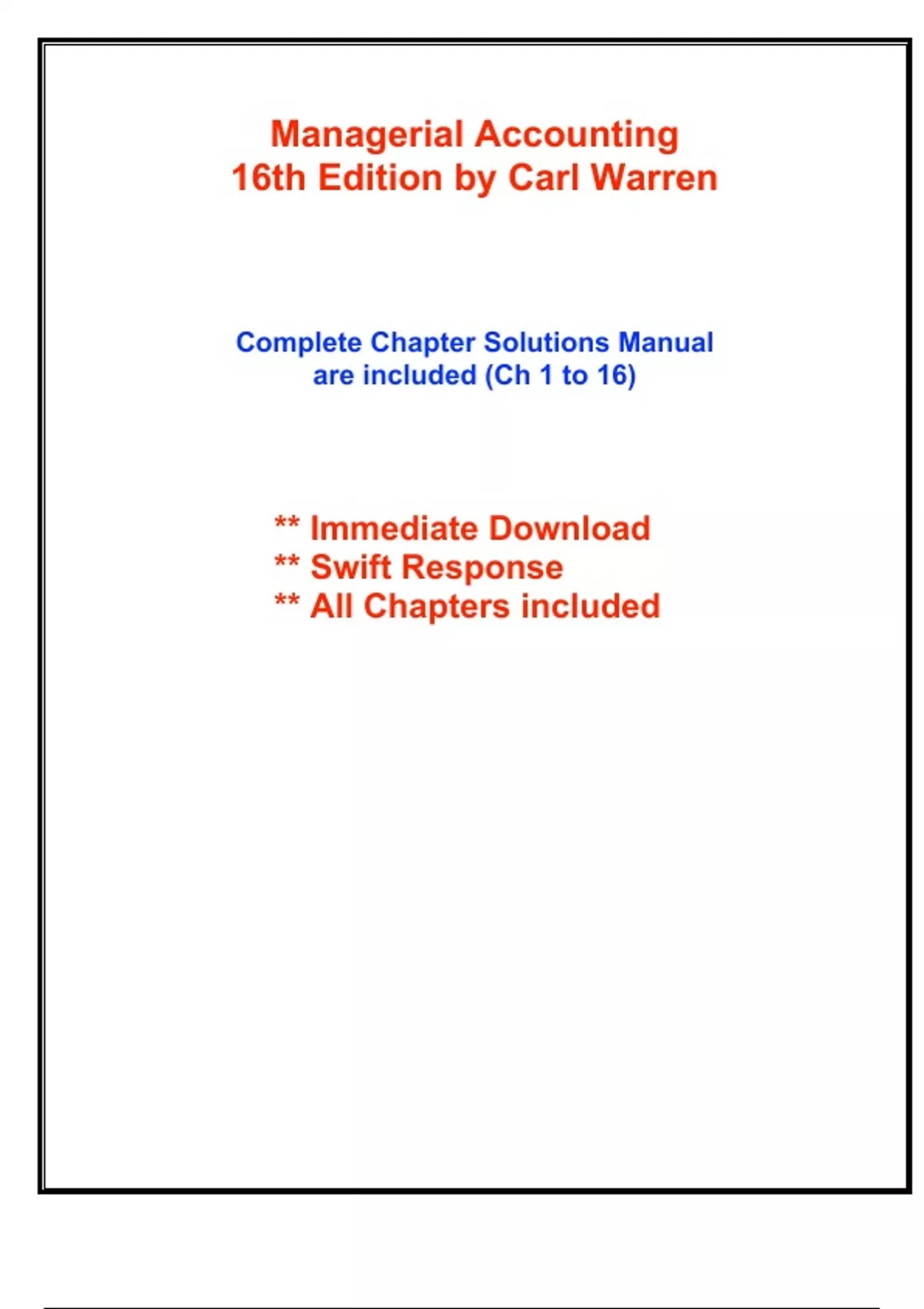 Complete Solutions Manual for Managerial Accounting, 16th Edition by Carl Warren, William B. Tayler ; ISBN13: 9780357715222. (Full Chapters included Chapter 1 to 16).... 1. Introduction to Managerial Accounting. 2. Job Order Costing. 3. Process Cost Systems. 4. Activity-Based Costing. 5. Support Department and Joint Cost Allocation. 6. Cost-Volume-Profit Analysis. 7. Variable Costing for Management Analysis. 8. Budgeting. 9. Evaluating Variances from Standard Costs. 10. Evaluating Decentralized Operations. 11. Differential Analysis and Product Pricing. 12. Capital Investment Analysis. 13. Lean Manufacturing and Activity Analysis. 14. The Balanced Scorecard and Corporate Social Responsibility. 15. Statement of Cash Flows. 16. Financial Statement Analysis.