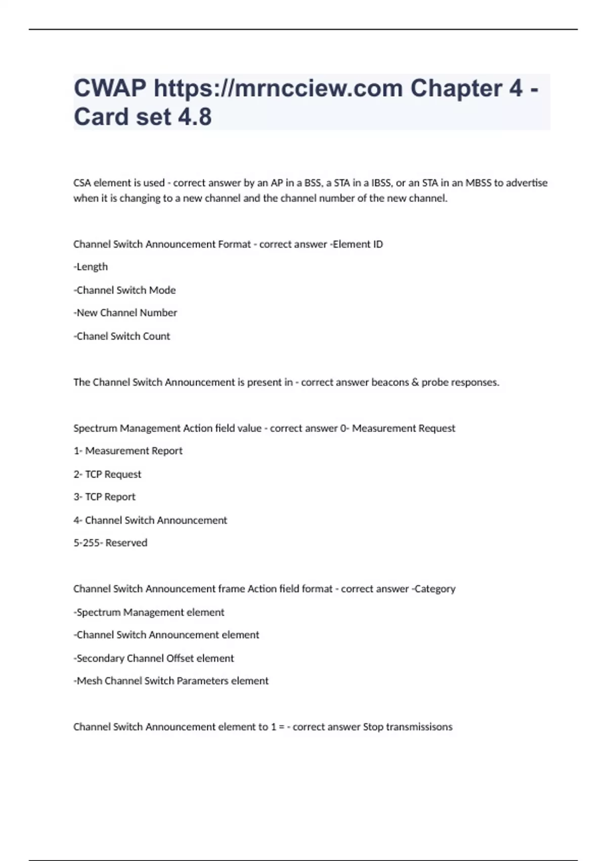 CWAP Chapter 4 - Card set 4.8 Question and answers correctly solved 2023/2024CSA element is used - correct answer by an AP in a BSS, a STA in a IBSS, or an STA in an MBSS to advertise when it is changing to a new channel and the channel number of the new channel. Channel Switch Announcement Format - correct answer -Element ID -Length -Channel Switch Mode -New Channel Number -Chanel Switch Count The Channel Switch Announcement is present in - correct answer beacons & probe responses. Spectrum Management Action field value - correct answer 0- Measurement Request 1- Measurement Rep