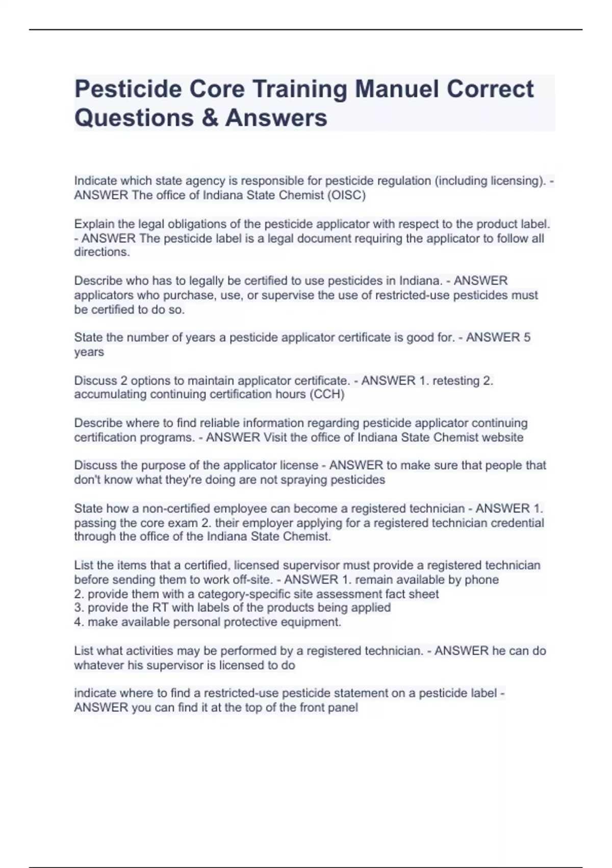 Indicate which state agency is responsible for pesticide regulation (including licensing). - ANSWER The office of Indiana State Chemist (OISC) Explain the legal obligations of the pesticide applicator with respect to the product label. - ANSWER The pesticide label is a legal document requiring the applicator to follow all directions. Describe who has to legally be certified to use pesticides in Indiana. - ANSWER applicators who purchase, use, or supervise the use of restricted-use pesticides must be certified to do so. State the number of years a pesticide applicator certificate is good for. - ANSWER 5 years Discuss 2 options to maintain applicator certificate. - ANSWER 1. retesting 2. accumulating continuing certification hours (CCH) Describe where to find reliable information regarding pesticide applicator continuing certification programs. - ANSWER Visit the office of Indiana State Chemist website Discuss the purpose of the applicator license - ANSWER to make sure that people that don't know what they're doing are not spraying pesticides State how a non-certified employee can become a registered technician - ANSWER 1. passing the core exam 2. their employer applying for a registered technician credential through the office of the Indiana State Chemist. List the items that a certified, licensed supervisor must provide a registered technician before sending them to work off-site. - ANSWER 1. remain availa