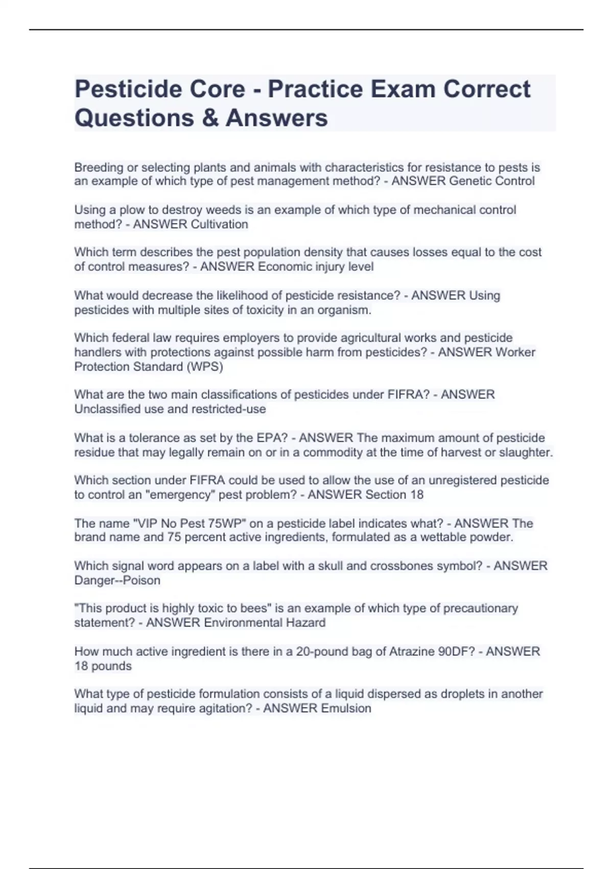 Pesticide Core - Practice Exam Correct Questions & Answers