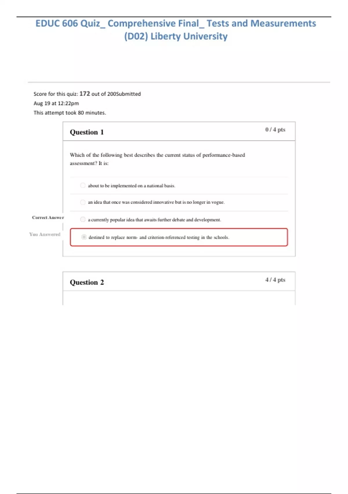 EDUC 606 Quiz_ Comprehensive Final_ Tests and Measurements (D02) Liberty University