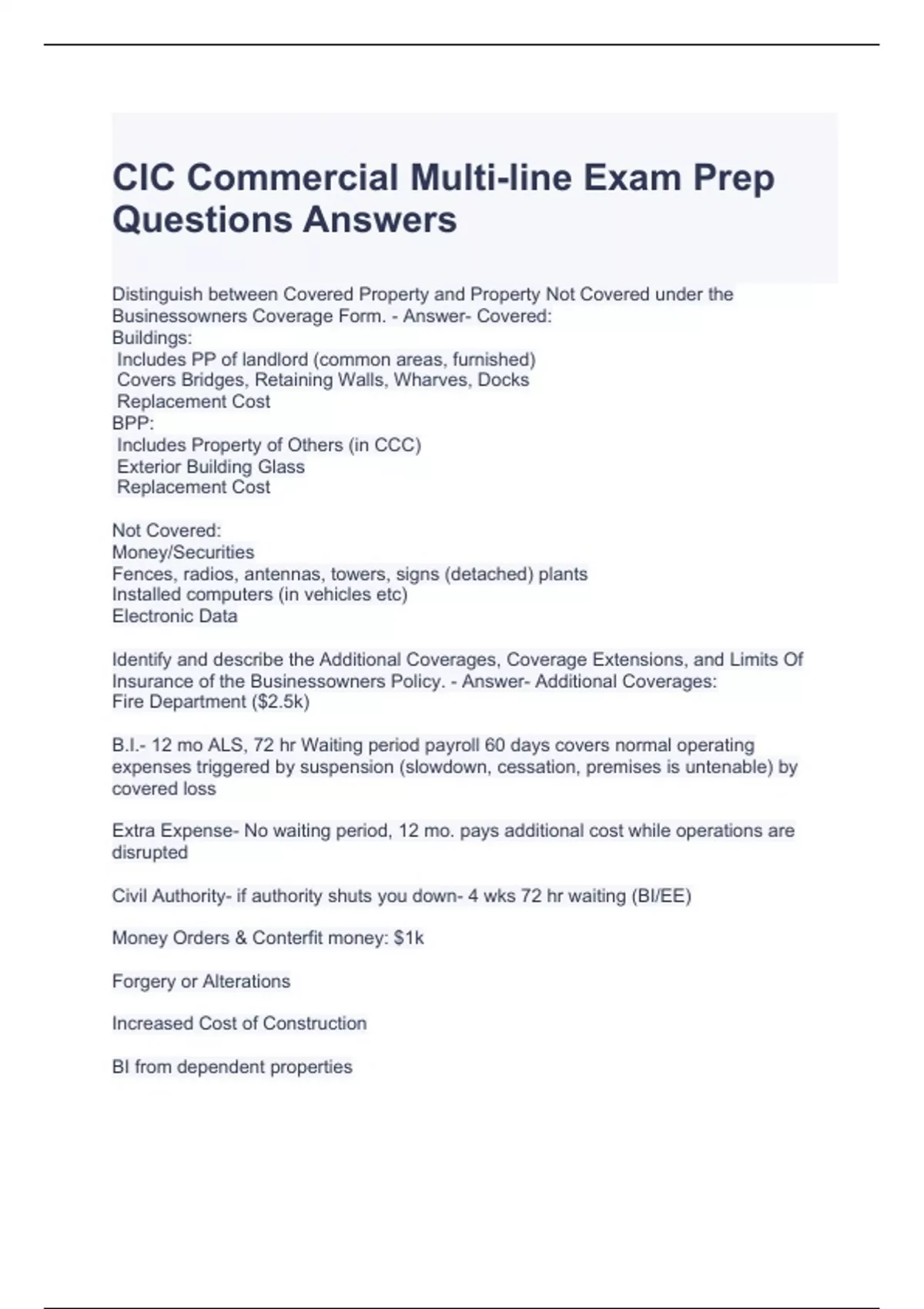 CIC Commercial Multi-line Exam Prep Questions Answers