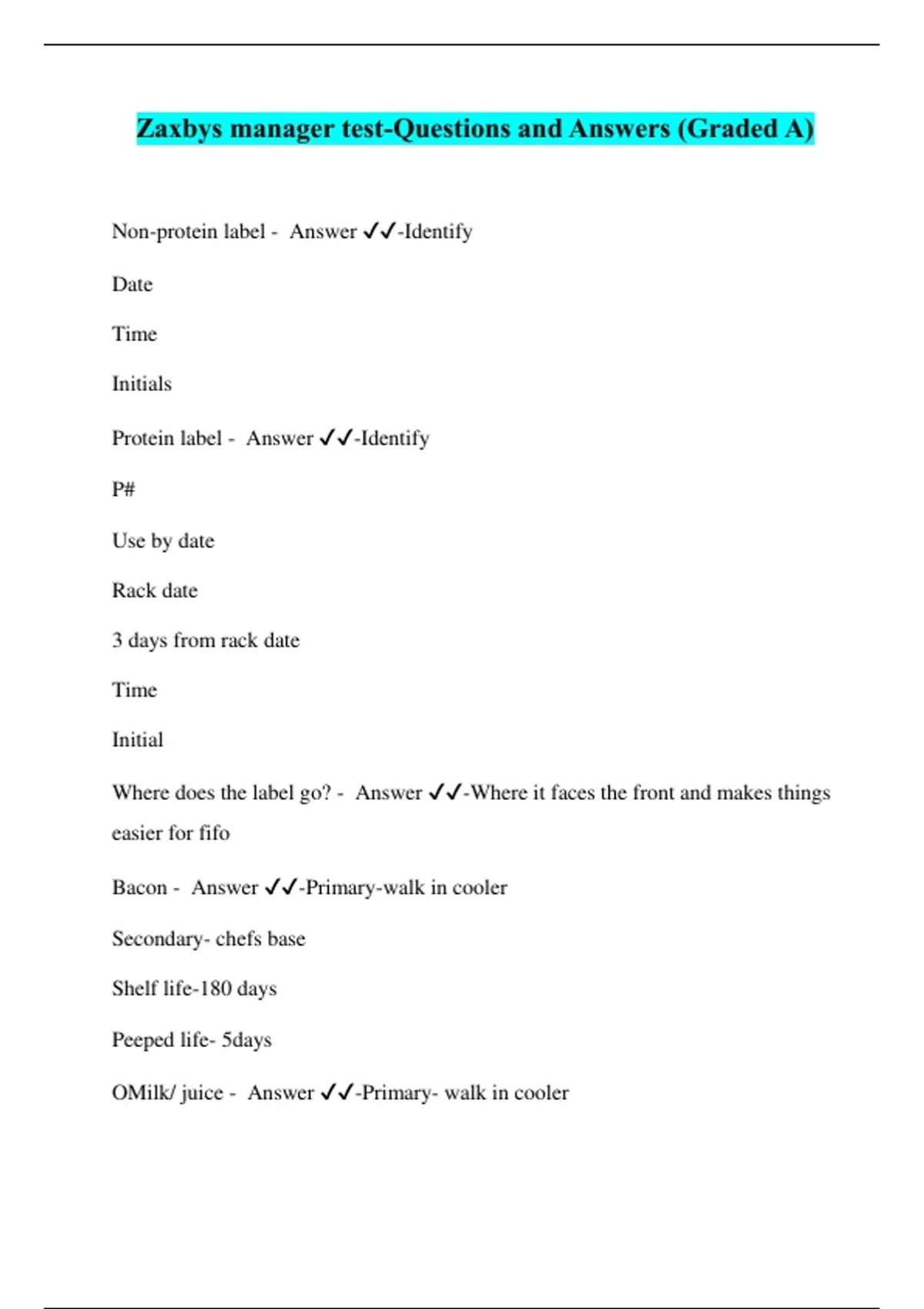 Zaxbys manager test-Questions and Answers (Graded A) Non-protein label - Answer ️️ -Identify Date Time Initials Protein label - Answer ️️ -Identify P# Use by date Rack date 3 days from rack date Time Initial Where does the label go? - Answer ️️ -Where it faces the front and makes things easier for fifo Bacon - Answer ️️ -Primary-walk in cooler Secondary- chefs base Shelf life-180 days Peeped life- 5days OMilk/ juice - Answer ️️ -Primary- walk in cooler