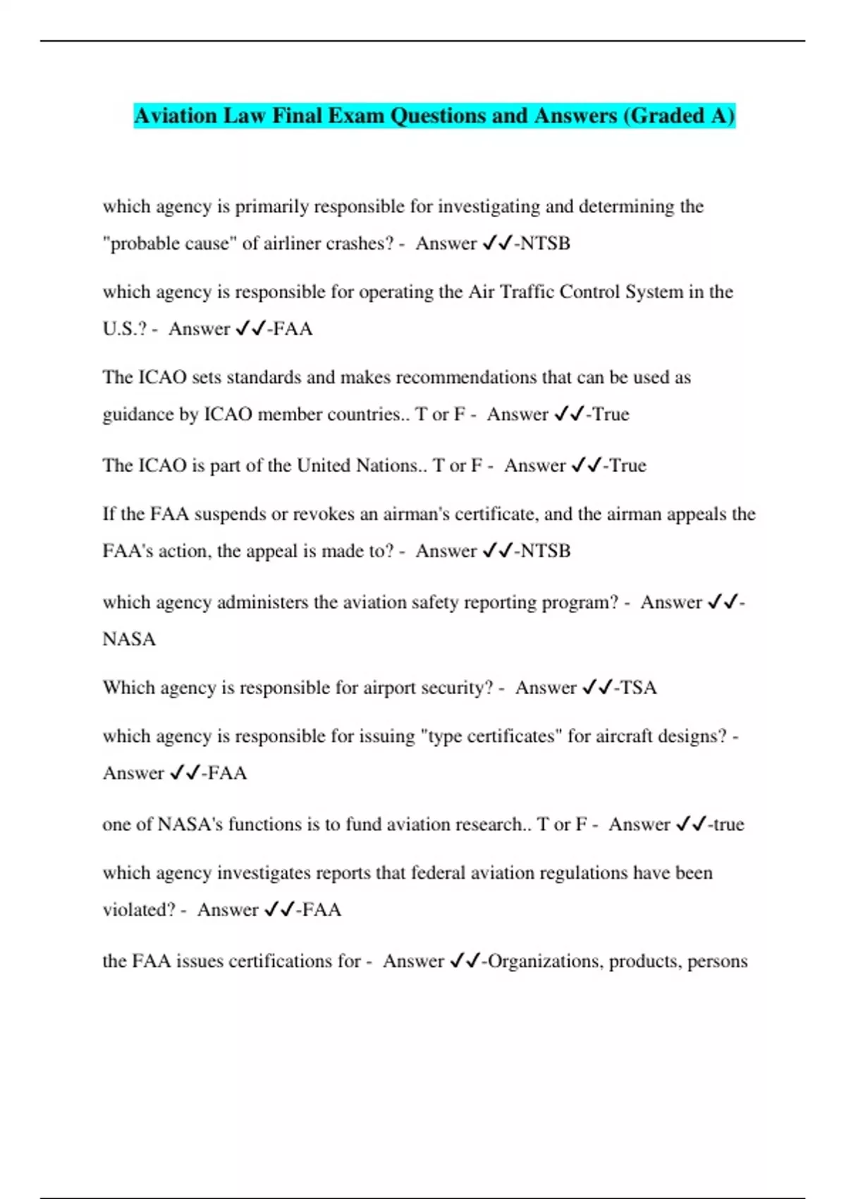Aviation Law Final Exam Questions and Answers (Graded A) which agency is primarily responsible for investigating and determining the "probable cause" of airliner crashes? - Answer ️️ -NTSB which agency is responsible for operating the Air Traffic Control System in the U.S.? - Answer ️️ -FAA The ICAO sets standards and makes recommendations that can be used as guidance by ICAO member countries.. T or F - Answer ️️ -True The ICAO is part of the United Nations.. T or F - Answer ️️ -True If the FAA suspends or revokes an airman's certificate, and the airman appeals the FAA's action, the appeal is made to? - Answer ️️ -NTSB which agency administers the aviation safety reporting program? - Answer ️️ - NASA Which agency is responsible for airport security? - Answer ️️ -TSA which agency is responsible for issuing "type certificates" for aircraft designs? - Answer ️️ -FAA one of NASA's functions is to fund aviation research.. T or F - Answer ️️ -true which agency investigates reports that federal aviation regulations have been violated? - Answer ️️ -FAA the FAA issues certifications for - Answer ️️ -Organizations, products, persons