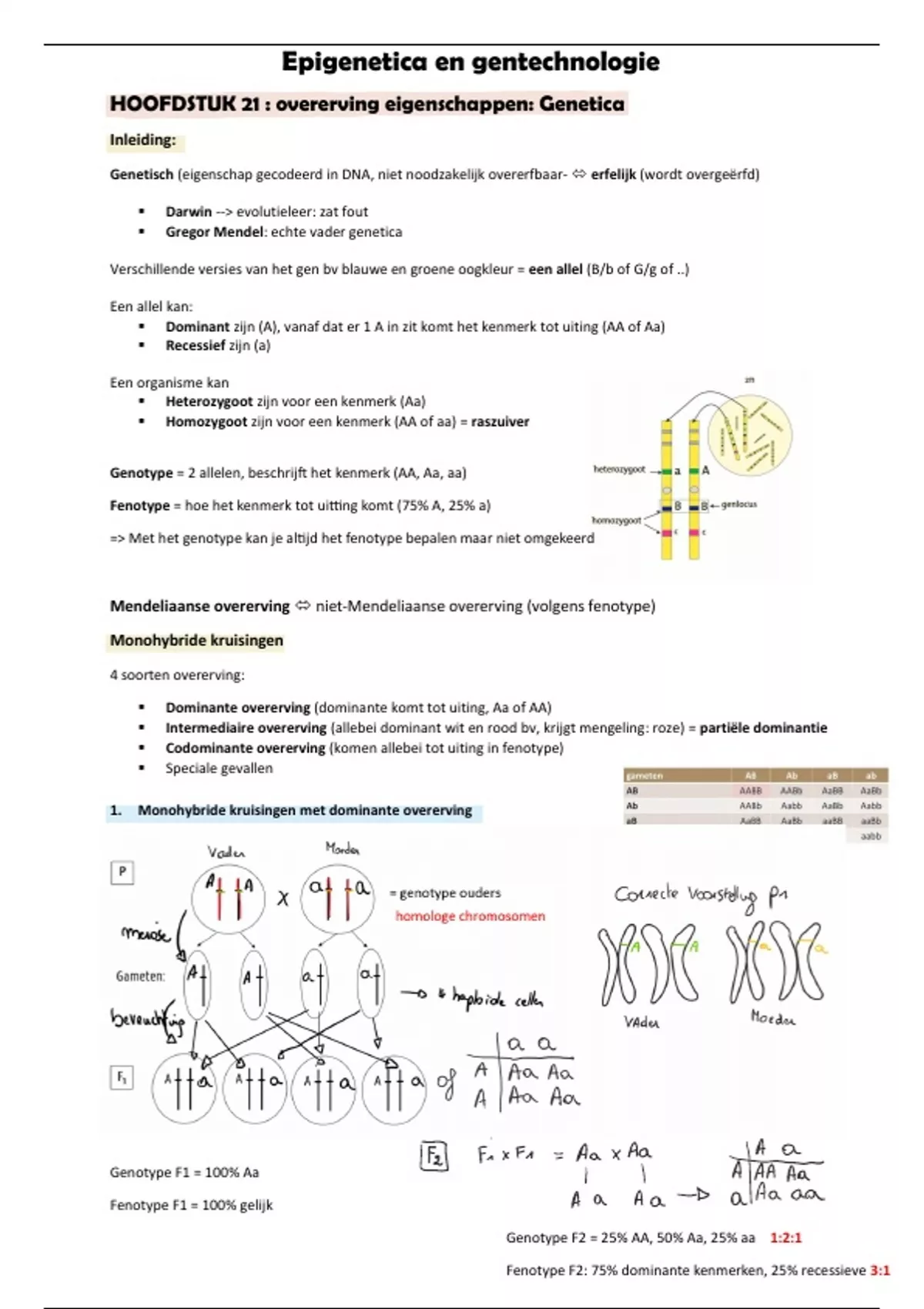 Dihybride: gaat over twee kenmerken bv A, a (zwart of blond) en B, b (blank of bruin) bv AaBb of AAbb,…