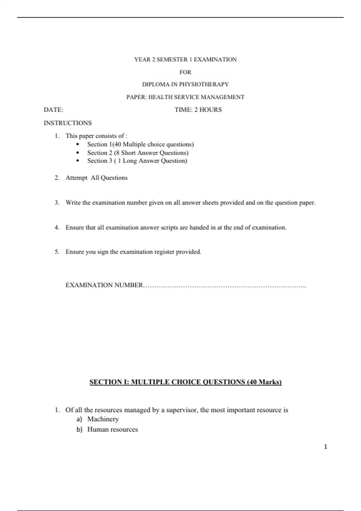 HSM 1 EXAM FOR PHYSIOTHERAPY
