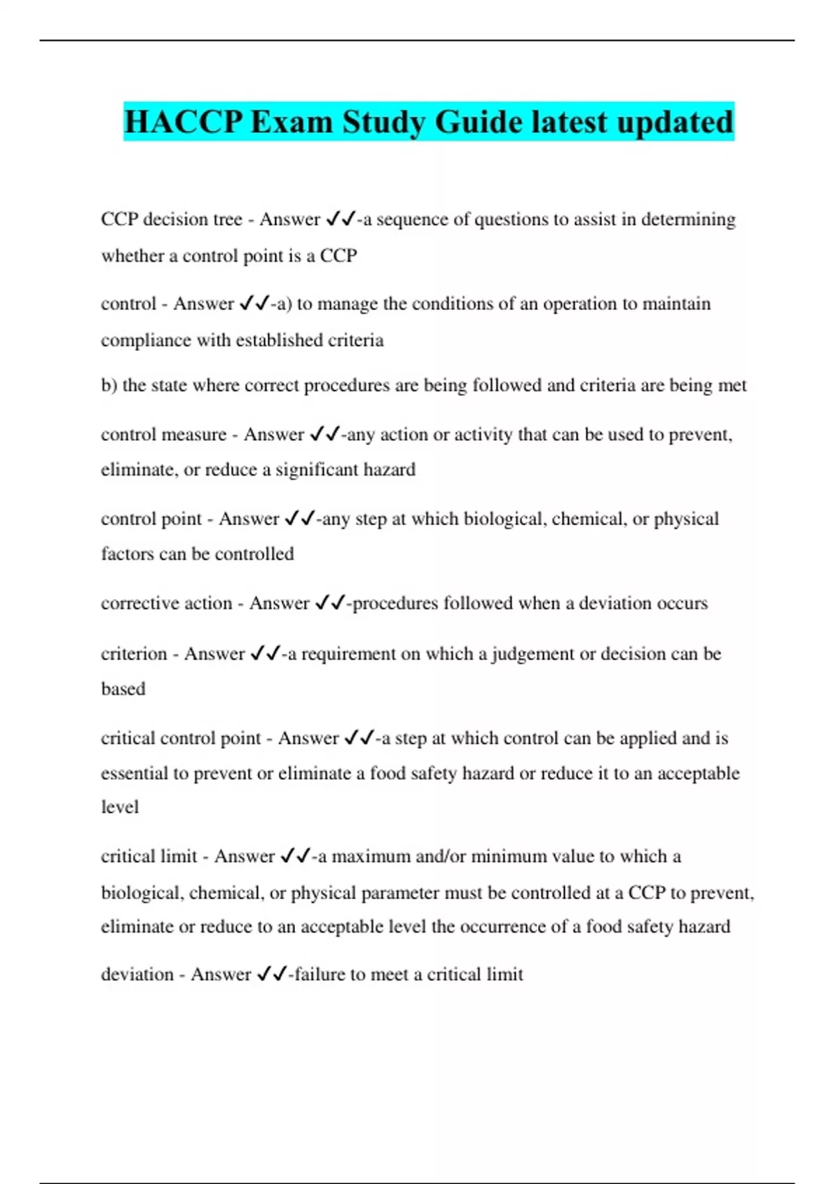 HACCP Exam Study Guide latest updated CCP decision tree - Answer ️️ -a sequence of questions to assist in determining whether a control point is a CCP control - Answer ️️ -a) to manage the conditions of an operation to maintain compliance with established criteria b) the state where correct procedures are being followed and criteria are being met control measure - Answer ️️ -any action or activity that can be used to prevent, eliminate, or reduce a significant hazard control point - Answer ️️ -any step at which biological, chemical, or physical factors can be controlled corrective action - Answer ️️ -procedures followed when a deviation occurs criterion - Answer ️️ -a requirement on which a judgement or decision can be based critical control point - Answer ️️ -a step at which control can be applied and is essential to prevent or eliminate a food safety hazard or reduce it to an acceptable level critical limit - Answer ️️ -a maximum and/or minimum value to which a biological, chemical, or physical parameter must be controlled at a CCP to prevent, eliminate or reduce to an acceptable level the occurrence of a food safety hazard deviation - Answer ️️ -failure to meet a critical limit