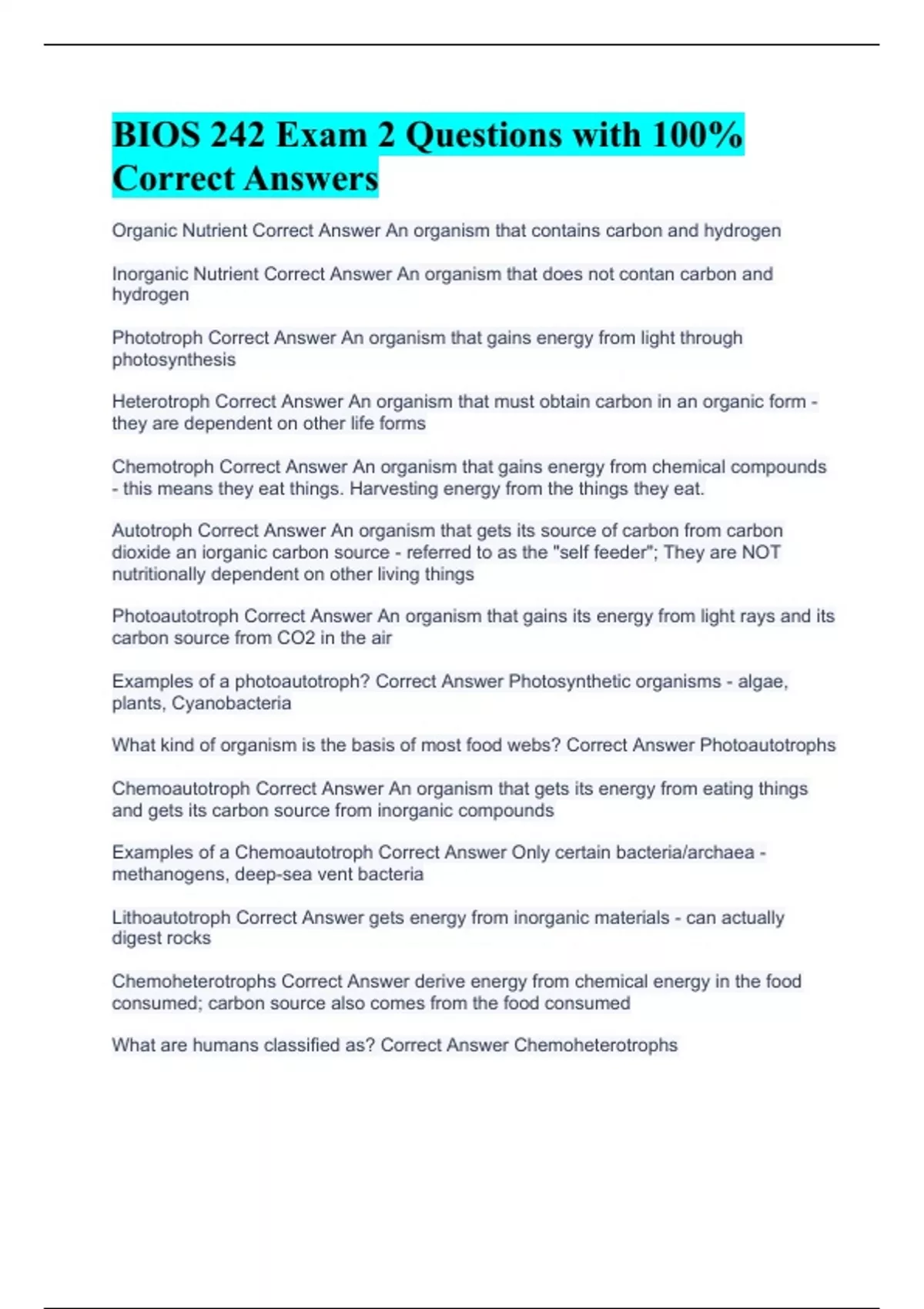 Organic Nutrient Correct Answer An organism that contains carbon and hydrogen Inorganic Nutrient Correct Answer An organism that does not contan carbon and hydrogen Phototroph Correct Answer An organism that gains energy from light through photosynthesis Heterotroph Correct Answer An organism that must obtain carbon in an organic form - they are dependent on other life forms Chemotroph Correct Answer An organism that gains energy from chemical compounds - this means they eat things. Harvesting energy from the things they eat. Autotroph Correct Answer An organism that gets its source of carbon from carbon dioxide an iorganic carbon source - referred to as the "self feeder"; They are NOT nutritionally dependent on other living things Photoautotroph Correct Answer An organism that gains its energy from light rays and its carbon source from CO2 in the air Examples of a photoautotroph? Correct Answer Photosynthetic organisms - algae, plants, Cyanobacteria What kind of organism is the basis of most food webs? Correct Answer Photoautotrophs Chemoautotroph Correct Answer An organism that gets its energy from eating things and gets its carbon source from inorganic compounds Examples of a Chemoautotroph Correct Answer Only certain bacteria/archaea - methanogens, deep-sea vent bacteria Lithoautotroph Correct Answer gets energy from inorganic materials - can actually digest rocks Chemoheterotrophs Correct Answer derive energy from chemical energy in the food consumed; carbon source also comes from the food consumed What are humans classified as? Correct Answer Chemoheterotrophs