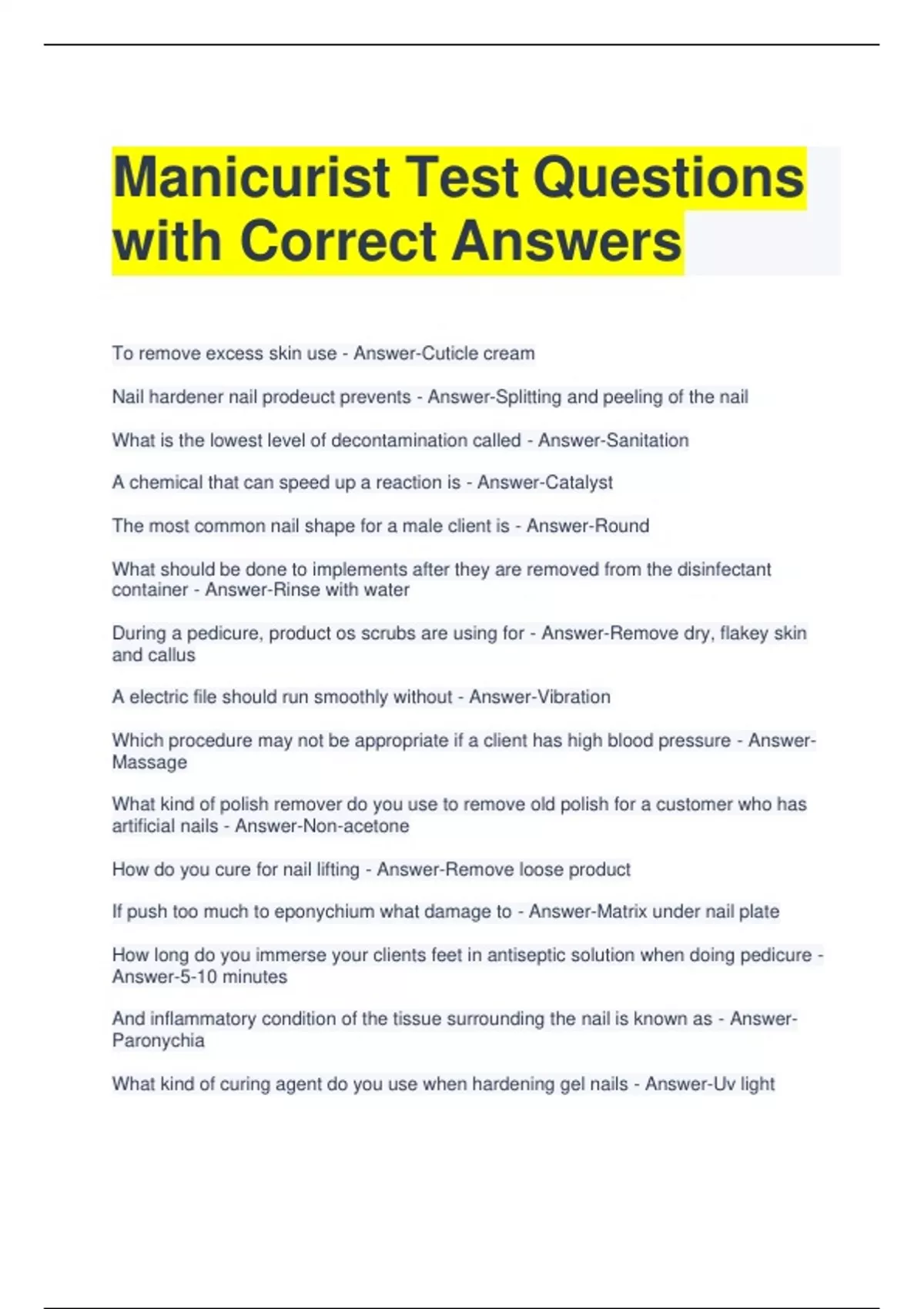 Manicurist Test Questions with Correct Answers To remove excess skin use - Answer-Cuticle cream Nail hardener nail prodeuct prevents - Answer-Splitting and peeling of the nail What is the lowest level of decontamination called - Answer-Sanitation A chemical that can speed up a reaction is - Answer-Catalyst The most common nail shape for a male client is - Answer-Round What should be done to implements after they are removed from the disinfectant container - Answer-Rinse with water During a pedicure, product os scrubs are using for - Answer-Remove dry, flakey skin and callus A electric file should run smoothly without - Answer-Vibration Which procedure may not be appropriate if a client has high blood pressure - Answer- Massage What kind of polish remover do you use to remove old polish for a customer who has artificial nails - Answer-Non-acetone How do you cure for nail lifting - Answer-Remove loose product If push too much to eponychium what damage to - Answer-Matrix under nail plate How long do you immerse your clients feet in antiseptic solution when doing pedicure - Answer-5-10 minutes