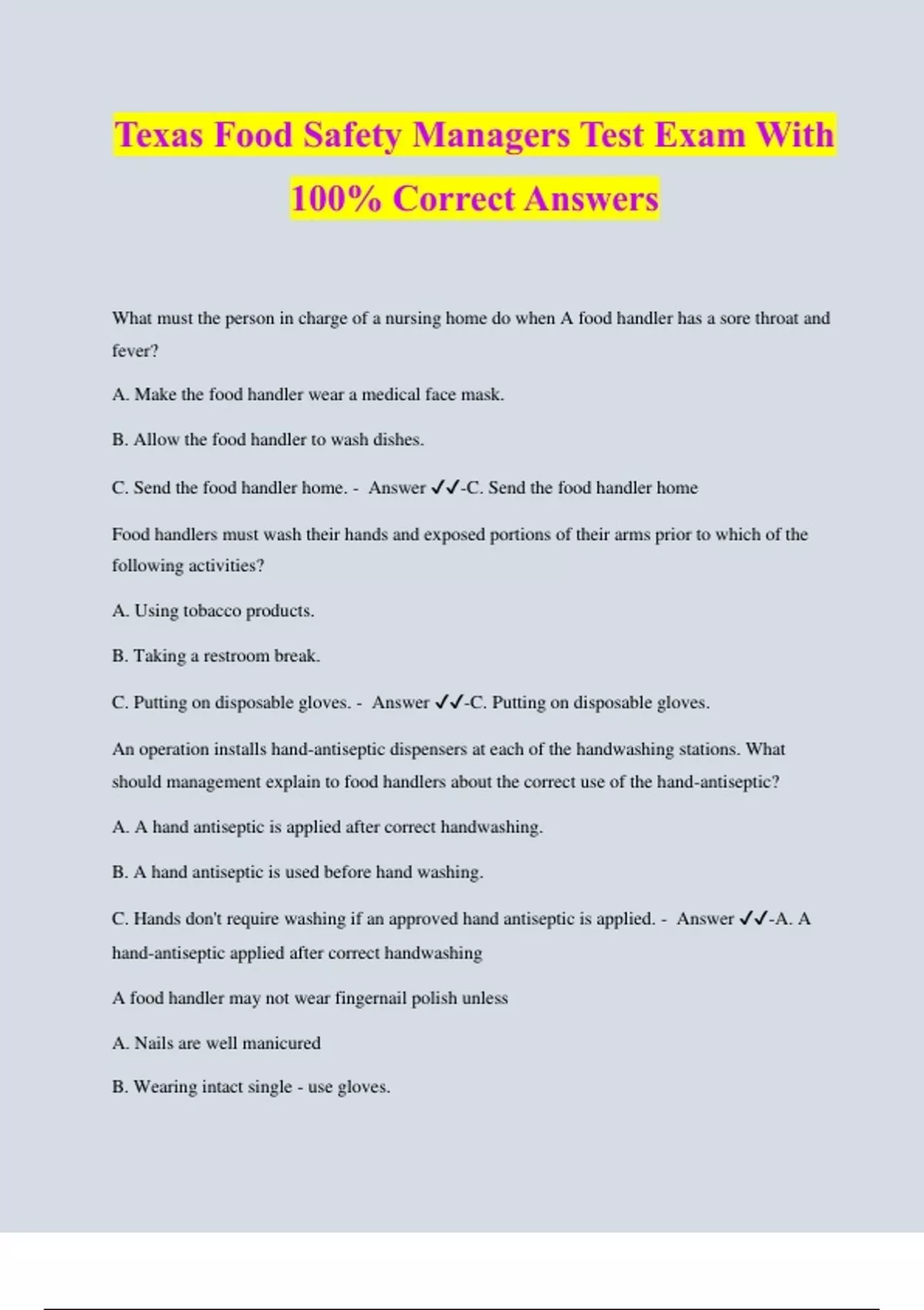 Texas Food Safety Managers Test Exam With 100% Correct Answers What must the person in charge of a nursing home do when A food handler has a sore throat and fever? A. Make the food handler wear a medical face mask. B. Allow the food handler to wash dishes. C. Send the food handler home. - Answer ️️ -C. Send the food handler home Food handlers must wash their hands and exposed portions of their arms prior to which of the following activities? A. Using tobacco products. B. Taking a restroom break. C. Putting on disposable gloves. - Answer ️️ -C. Putting on disposable gloves. An operation installs hand-antiseptic dispensers at each of the handwashing stations. What should management explain to food handlers about the correct use of the hand-antiseptic? A. A hand antiseptic is applied after correct handwashing. B. A hand antiseptic is used before hand washing. C. Hands don't require washing if an approved hand antiseptic is applied. - Answer ️️ -A. A hand-antiseptic applied after correct handwashing A food handler may not wear fingernail polish unless A. Nails are well manicured B. Wearing intact single - use gloves. C. Hands are clean and sanitized - Answer ️️ -B. Wearing intact single-use gloves. The person in charge must exclude the food handler when he or she reports having which symptom? A. Yellow skin and eyes B. Infected lesion. C. Sore throat with fever - Answer ️️ -A. Yellow skin and eyes Cooked plants products that are served from a steamtable must be maintained at what minimum temperature? A. 155°F B. 145°F C. 135°F - Answer ️️ -C. 135°F The "T "in the ALERT food defense awareness program deals with A. Tasks B. Threats C. Temperature - Answer ️️ -B. Threa