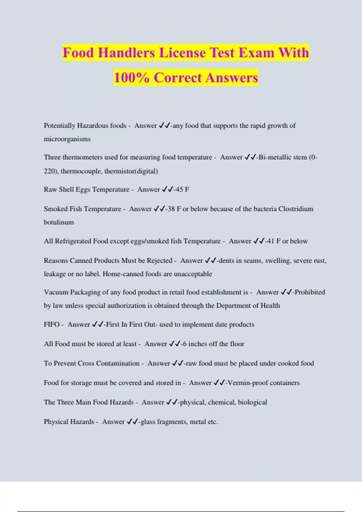 Food Handlers License Test Exam With 100% Correct Answers Potentially Hazardous foods - Answer ️️ -any food that supports the rapid growth of microorganisms Three thermometers used for measuring food temperature - Answer ️️ -Bi-metallic stem (0- 220), thermocouple, thermistor(digital) Raw Shell Eggs Temperature - Answer ️️ -45 F Smoked Fish Temperature - Answer ️️ -38 F or below because of the bacteria Clostridium botulinum All Refrigerated Food except eggs/smoked fish Temperature - Answer ️️ -41 F or below Reasons Canned Products Must be Rejected - Answer ️️ -dents in seams, swelling, severe rust, leakage or no label. Home-canned foods are unacceptable Vacuum Packaging of any food product in retail food establishment is - Answer ️️ -Prohibited by law unless special authorization is obtained through the Department of Health FIFO - Answer ️️ -First In First Out- used to implement date products All Food must be stored at least - Answer ️️ -6 inches off the floor To Prevent Cross Contamination - Answer ️️ -raw food must be placed under cooked food Food for storage must be covered and stored in - Answer ️️ -Vermin-proof containers The Three Main Food Hazards - Answer ️️ -physical, chemical, biological Physical Hazards - Answer ️️ -glass fragments, metal etc