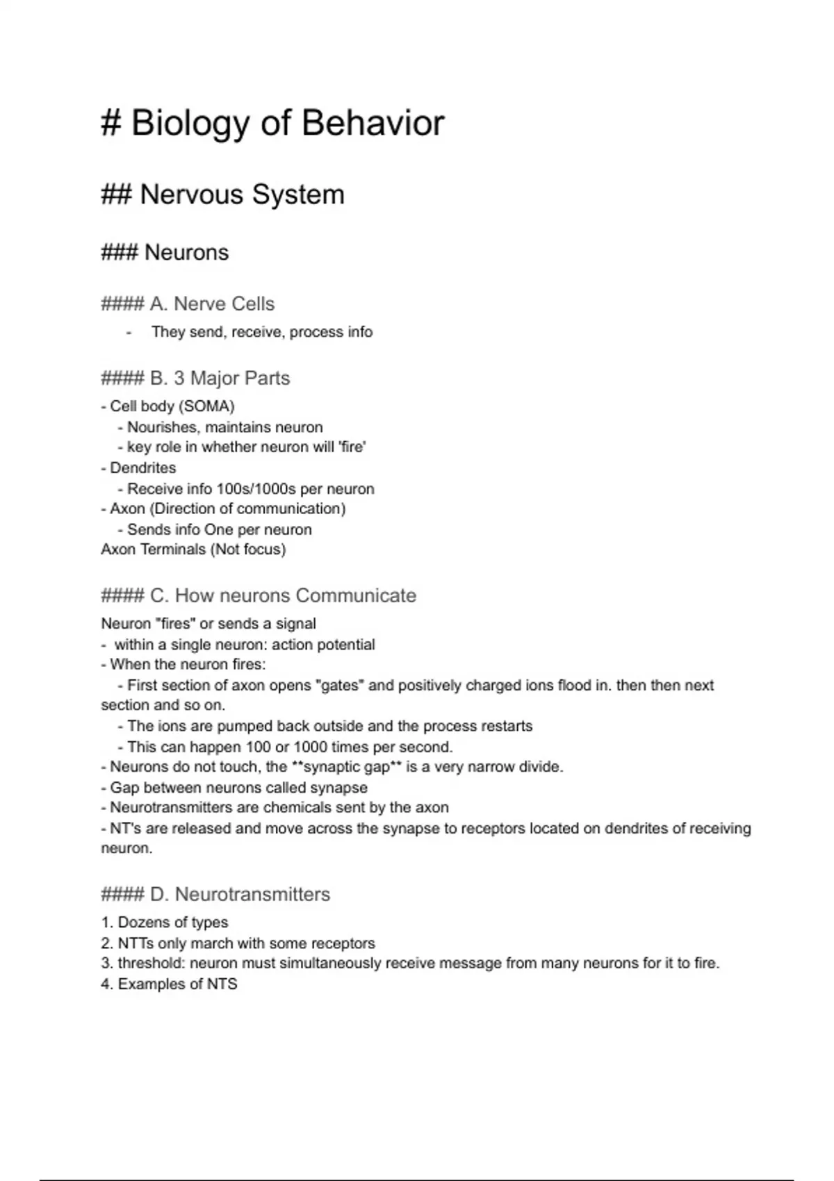 These are class notes from General Psychology, covering the basics of biology and psychology. Neurons, subsystems, and the brain.