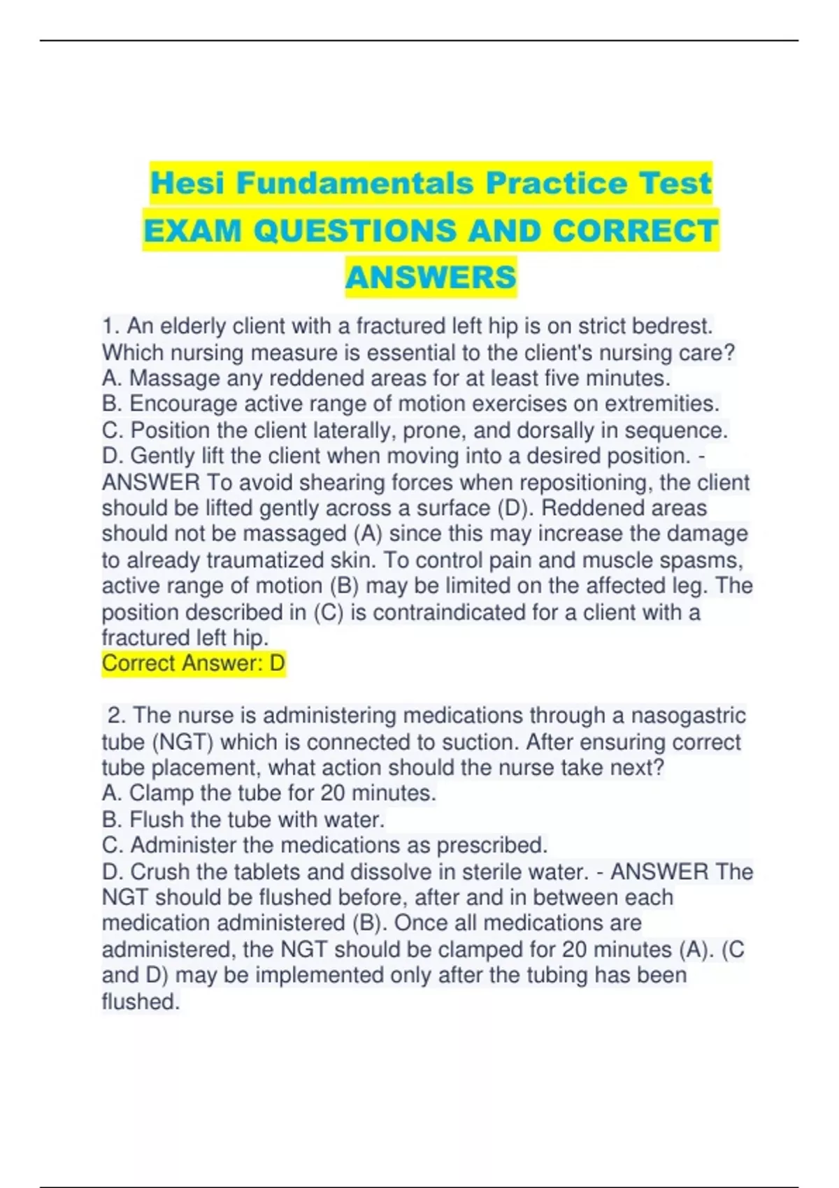 Hesi Fundamentals Practice Test EXAM QUESTIONS AND CORRECT ANSWERS 1. An elderly client with a fractured left hip is on strict bedrest. Which nursing measure is essential to the client's nursing care? A. Massage any reddened areas for at least five minutes. B. Encourage active range of motion exercises on extremities. C. Position the client laterally, prone, and dorsally in sequence. D. Gently lift the client when moving into a desired position. - ANSWER To avoid shearing forces when repositioning, the client should be lifted gently across a surface (D). Reddened areas should not be massaged (A) since this may increase the damage to already traumatized skin. To control pain and muscle spasms, active range of motion (B) may be limited on the affected leg. The position described in (C) is contraindicated for a client with a fractured left hip. Correct Answer: D 2. The nurse is administering medications through a nasogastric tube (NGT) which is connected to suction. After ensuring correct tube placement, what action should the nurse take next? A. Clamp the tube for 20 minutes. B. Flush the tube with water. C. Administer the medications as prescribed. D. Crush the tablets and dissolve in sterile water. - ANSWER The NGT should be flushed before, after and in between each medication administered (B). Once all medications are administered, the NGT should be clamped for 20 minutes (A). (C and D) may be implemented only after the tubing has been flushed. Correct Answer: B 3. A client who is in hospice care complains of increasing amounts of pain. The healthcare provider prescribes an analgesic every four hours as needed. Which action should the nurse implement? A. Give an around-the-clock schedule for administration of analgesics. B. Administer analgesic medication as needed when the pain is severe. C. Provide medication to keep the client sedated and unaware of stimuli. D. Offer a medication-free period so that the client can do daily activities. - ANSWER The most effective management of pain is achieved using an around-the-clock schedule that provides analgesic medications on a regular basis (A) and in a timely manner. Analgesics are less effective if pain persists until it is severe, so an analgesic medication should be administered before the client's pain peaks (B). Providing comfort is a priority for the client who is dying, but sedation that impairs the client's ability to interact and experience the time before life ends should be minimized (C). Offering a medication-free period allows the serum drug level to fall, which is not an effective method to manage chronic pain (D). Correct Answer: A 4. When assessing a client with wrist restraints, the nurse observes that the fingers on the right hand are blue. What action should the nurse implement first? A. Loosen the right wrist restraint. B. Apply a pulse oximeter to the right hand. C. Compare hand color bilaterally. D. Palpate the right radial pulse. - ANSWER The priority nursing action is to restore circulation by loosening the restraint (A), because blue fingers (cyanosis) indicates decreased circulation. (C and D) are also important nursing interventions, but do not have the priority of (A). Pulse oximetry (B) measures the saturation of hemoglobin with oxygen and is not indicated in situations where the cyanosis is related to mechanical compression (the restraints). Correct Answer: A 5. The nurse is assessing the nutritional status of several clients. Which client has the greatest nutritional need for additional intake of protein? A. A college-age track runner with a sprained ankle. B. A lactating woman nursing her 3-day-old infant. C. A school-aged child with Type 2 diabetes. D. An elderly man being treated for a peptic ulcer. - ANSWER A lactating woman (B) has the greatest need for additional protein intake. (A, C, and D) are all conditions that require protein, but do not have the increased metabolic protein demands of lactation. Correct Answer: B 6. A client is in the radiology department at 0900 when the prescription levofloxacin (Levaquin) 500 mg IV q24h is scheduled to be administered. The client returns to the unit at 1300. What is the best intervention for the nurse to implement? A. Contact the healthcare provider and complete a medication variance form. B. Administer the Levaquin at 1300 and resume the 0900 schedule in the morning. C. Notify the charge nurse and complete an incident report to explain the missed dose. D. Give the missed dose at 1300 and change the schedule to administer daily at 1300. - ANSWER To ensure that a therapeutic level of medication is maintained, the nurse should administer the missed dose as soon as possible, and revise the administration schedule accordingly to prevent dangerously increasing the level of the medication in the bloodstream (D). The nurse should document the reason for the late dose, but (A and C) are not warranted. (B) could result in increased blood levels of the drug. Correct Answer: D 7. While instructing a male client's wife in the performance of passive range-of-motion exercises to his contracted shoulder, the nurse observes that she is holding his arm above and below the elbow. What nursing action should the nurse implement? A. Acknowledge that she is supporting the arm correctly. B. Encourage her to keep the joint covered to maintain warmth. C. Reinforce the need to grip directly under the joint for better support. D. Instruct her to grip directly over the joint for better motion. - ANSWER The wife is performing the passive ROM correctly, therefore the nurse should acknowledge this fact (A). The joint that is being exercised should be uncovered (B) while the rest of the body should remain covered for warmth and privacy. (C and D) do not provide adequate support to the joint while still allowing for joint movement. Correct Answer: A