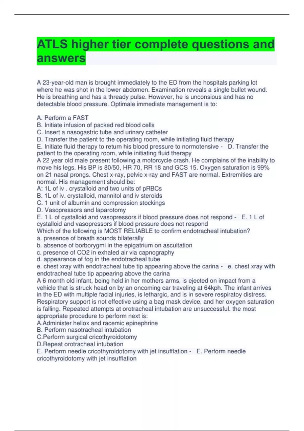 ATLS higher tier complete questions and answers A 23-year-old man is brought immediately to the ED from the hospitals parking lot where he was shot in the lower abdomen. Examination reveals a single bullet wound. He is breathing and has a thready pulse. However, he is unconsious and has no detectable blood pressure. Optimale immediate management is to: A. Perform a FAST B. Initiate infusion of packed red blood cells C. Insert a nasogastric tube and urinary catheter D. Transfer the patient to the operating room, while initiating fluid therapy E. Initiate fluid therapy to return his blood pressure to normotensive - D. Transfer the patient to the operating room, while initiating fluid therapy A 22 year old male present following a motorcycle crash. He complains of the inability to move his legs. His BP is 80/50, HR 70, RR 18 and GCS 15. Oxygen saturation is 99% on 21 nasal prongs. Chest x-ray, pelvic x-ray and FAST are normal. Extremities are normal. His management should be: A: 1L of iv . crystalloid and two units of pRBCs B. 1L of iv. crystalloid, mannitol and iv steroids C. 1 unit of albumin and compression stockings D. Vasopressors and laparotomy E. 1 L of cystalloid and vasopressors if blood pressure does not respond - E. 1 L of cystalloid and vasopressors if blood pressure does not respond Which of the following is MOST RELIABLE to confirm endotracheal intubation? a. presence of breath sounds bilaterally b. absence of borborygmi in the epigatrium on ascultation c. presence of CO2 in exhaled air via capnography d. appearance of fog in the endotracheal tube e. chest xray with endotracheal tube tip appearing above the carina - e. chest xray with endotracheal tube tip appearing above the carina A 6 month old infant, being held in her mothers arms, is ejected on impact from a vehicle that is struck head on by an oncoming car traveling at 64kph. The infant arrives in the ED with multiple facial injuries, is lethargic, and is in severe respiratoy distress. Respiratory support is not effective using a bag mask device, and her oxygen saturation is falling. Repeated attempts at orotracheal intubation are unsuccessful. the most appropriate procedure to perform next is: A.Administer heliox and racemic epinephrine B. Perform nasotracheal intubation C.Perform surgical cricothyroidotomy D.Repeat orotracheal intubation E. Perform needle cricothyroidotomy with jet insufflation - E. Perform needle cricothyroidotomy with jet insufflation A 28 year olf male is brought to the ED. He was involved in a fight, during which he was beaten with a wooden stick. His chest shows multiple severe bruises. His arway is clear, resp rate is 22, hear rate 126, and systolic blood pressure is 90 mmHG. Which of the following should be performed during the primary survey a. glasgow coma b. tetanus status c. cervical spine xray d. blood alcohol level