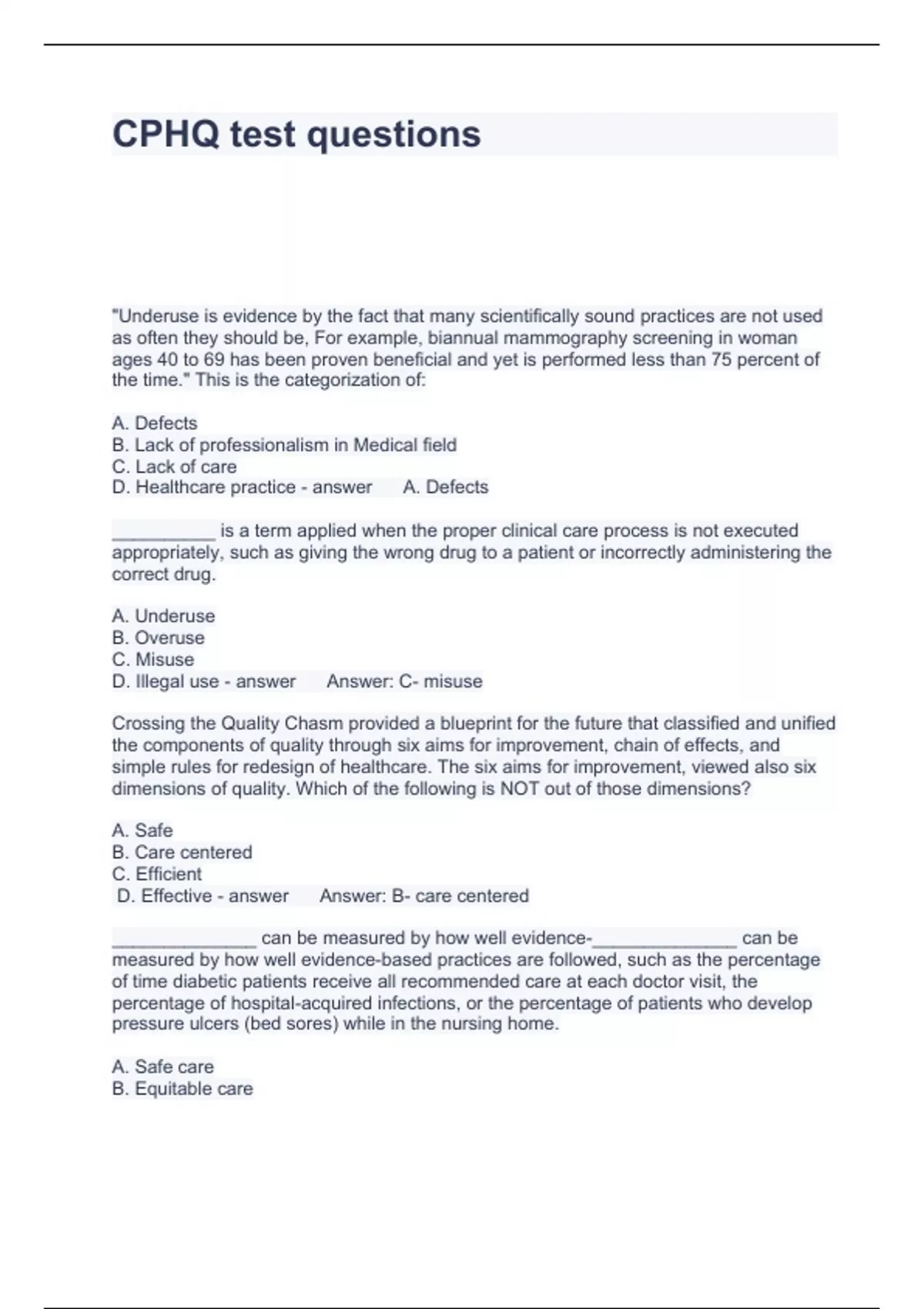 Exam of 10 pages for the course CPHQ at CPHQ (CPHQ test questions)