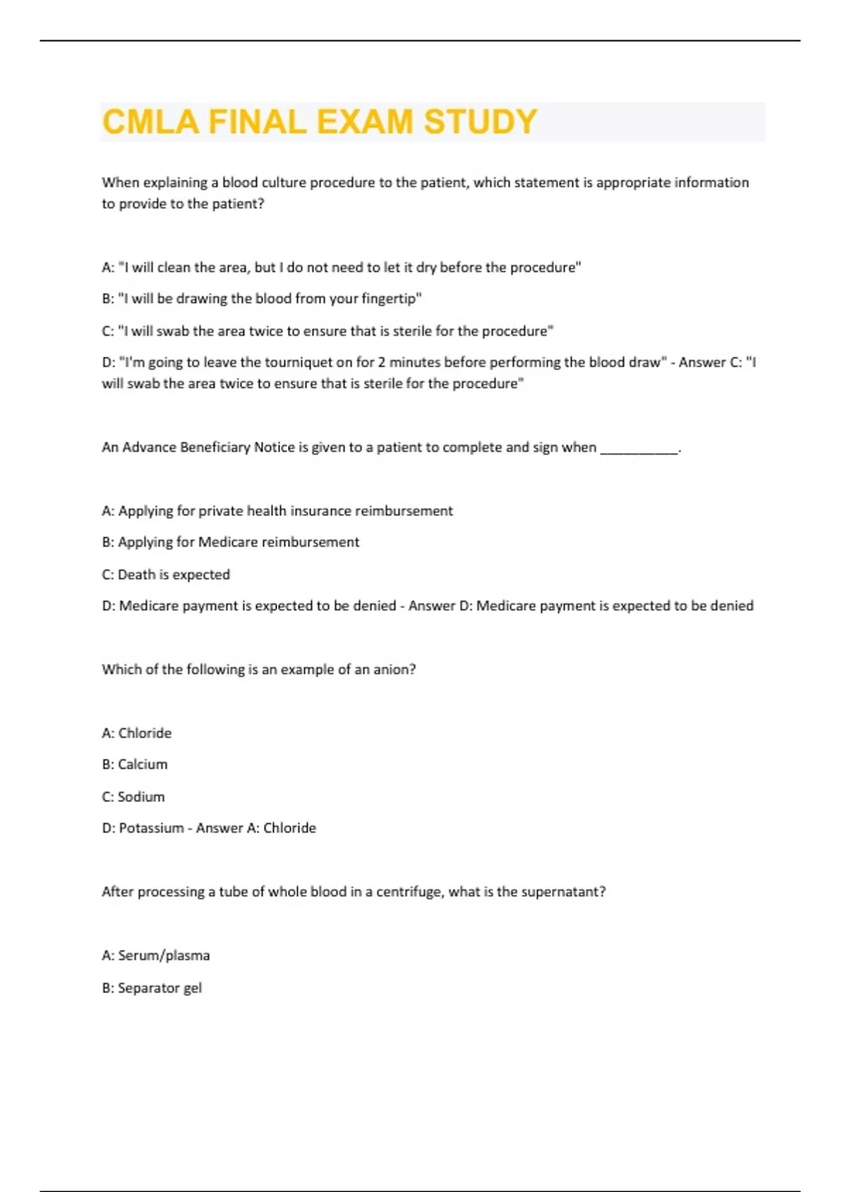 When explaining a blood culture procedure to the patient, which statement is appropriate information to provide to the patient? A: "I will clean the area, but I do not need to let it dry before the procedure" B: "I will be drawing the blood from your fingertip" C: "I will swab the area twice to ensure that is sterile for the procedure" D: "I'm going to leave the tourniquet on for 2 minutes before performing the blood draw" - Answer C: "I will swab the area twice to ensure that is sterile for the procedure" An Advance Beneficiary Notice is given to a patient to complete and sign when __________. A: Applying for private health insurance reimbursement B: Applying for Medicare reimbursement C: Death is expected D: Medicare payment is expected to be denied - Answer D: Medicare payment is expected to be denied Which of the following is an example of an anion? A: Chloride B: Calcium C: Sodium D: Potassium - Answer A: Chloride After processing a tube of whole blood in a centrifuge, what is the supernatant? A: Serum/plasma B: Separator gelC: Blood cells D: Whole blood - Answer A: Serum/plasma Which is the best course of action if a control value falls outside of the acceptable range when using a glucometer? A: Report to a supervisor then run a patient sample B: Run a patient sample C: Take correct action and repeat the control D: Notify the patient that they cannot be tested today - Answer C: Take correct action and repeat the control When providing instructions to a patient to collect a sputum sample, which of the following is the most appropriate direction? A: "You should provide the specimen in the morning after eating" B: "You should provide the specimen tomorrow" C: "You should provide the specimen in the evening after eating dinner" D: "You should provide the specimen in the morning before eating or drinking" - Answer D: "You should provide the specimen in the morning before eating or drinking"