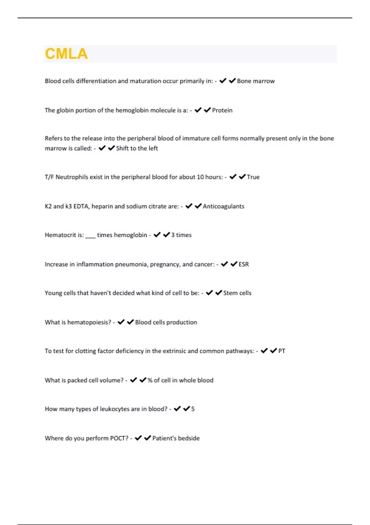 Blood cells differentiation and maturation occur primarily in: - Bone marrow The globin portion of the hemoglobin molecule is a: - Protein Refers to the release into the peripheral blood of immature cell forms normally present only in the bone marrow is called: - Shift to the left T/F Neutrophils exist in the peripheral blood for about 10 hours: - True K2 and k3 EDTA, heparin and sodium citrate are: - Anticoagulants Hematocrit is: ___ times hemoglobin - 3 times Increase in inflammation pneumonia, pregnancy, and cancer: - ESR Young cells that haven't decided what kind of cell to be: - Stem cells What is hematopoiesis? - Blood cells production To test for clotting factor deficiency in the extrinsic and common pathways: - PT What is packed cell volume? - % of cell in whole blood How many types of leukocytes are in blood? - 5 Where do you perform POCT? - Patient's bedsideWhat medication the prothrombin time(PT) test monitoring? - Warfarin To test for clotting factor deficiencies in the intrinsic and common pathway: - PTT What medication the partial thromboplastin time(PTT) test monitoring? - Heparin