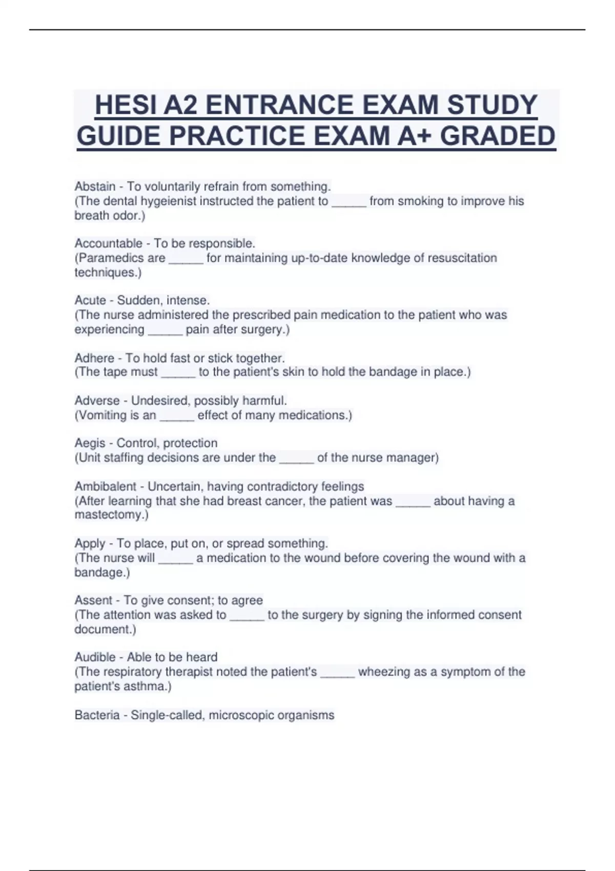 HESI A2 ENTRANCE EXAM STUDY GUIDE PRACTICE EXAM A+ GRADED