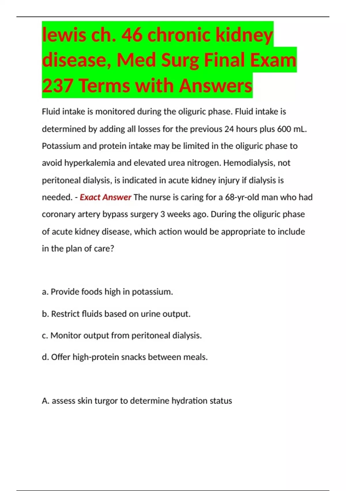lewis ch. 46 chronic kidney disease, Med Surg Final Exam 237 Terms with Answers