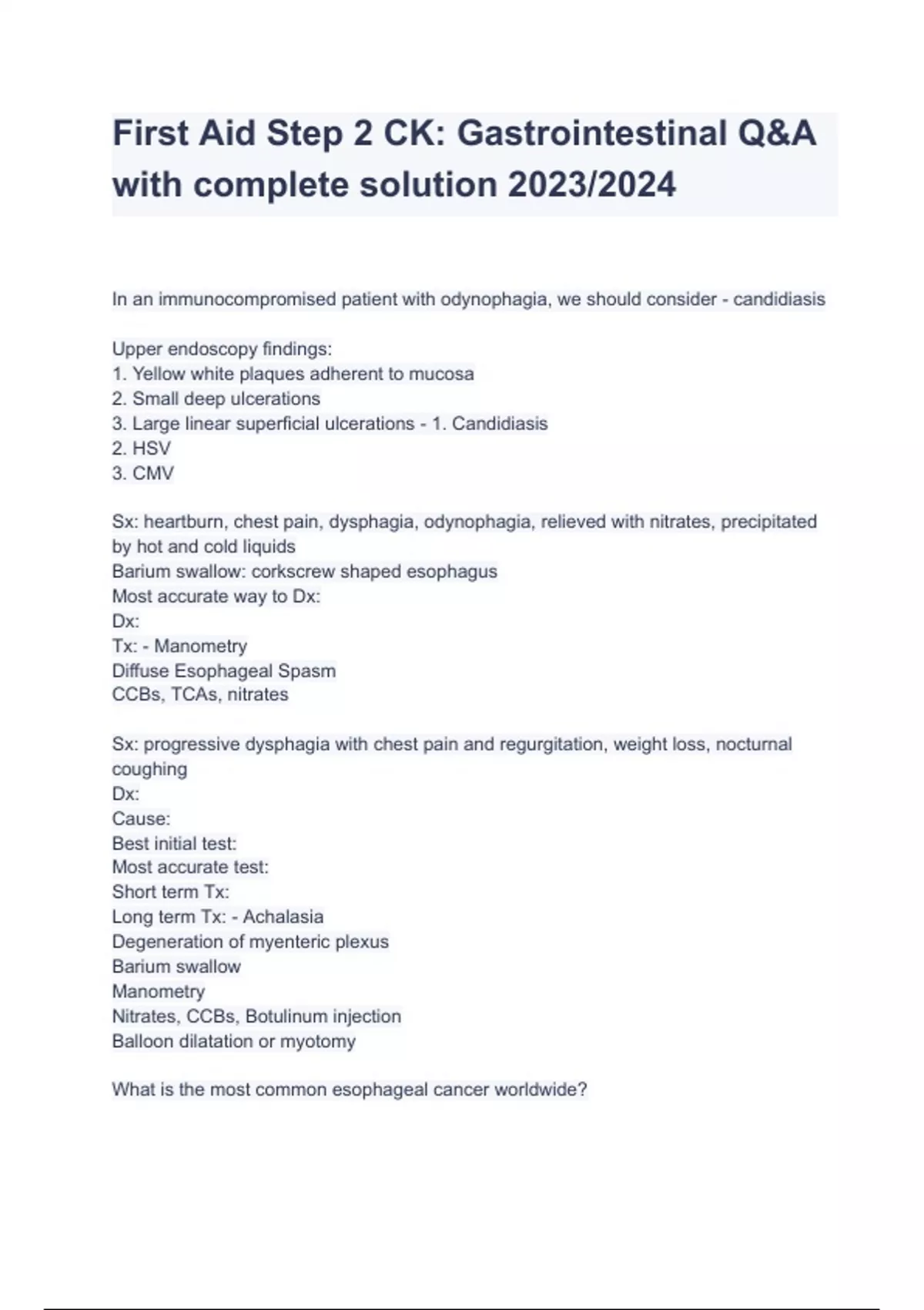 First Aid Step 2 CK: Gastrointestinal Q&A with complete solution 2023/2024