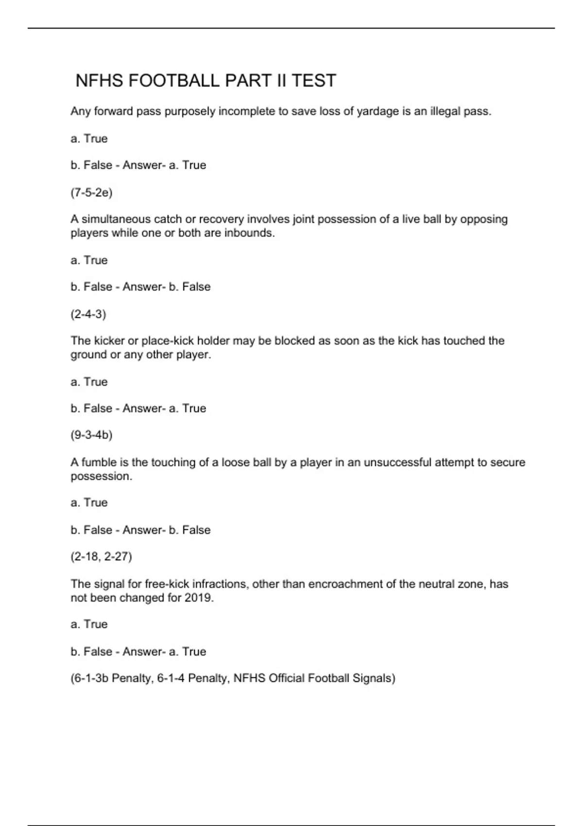 Any forward pass purposely incomplete to save loss of yardage is an illegal pass. a. True b. False - Answer- a. True (7-5-2e) A simultaneous catch or recovery involves joint possession of a live ball by opposing players while one or both are inbounds. a. True b. False - Answer- b. False (2-4-3) The kicker or place-kick holder may be blocked as soon as the kick has touched the ground or any other player. a. True b. False - Answer- a. True (9-3-4b) A fumble is the touching of a loose ball by a player in an unsuccessful attempt to secure possession. a. True b. False - Answer- b. False (2-18, 2-27) The signal for free-kick infractions, other than encroachment of the neutral zone, has not been changed for 2019. a. True b. False - Answer- a. True (6-1-3b Penalty, 6-1-4 Penalty, NFHS Official Football Signals) Re