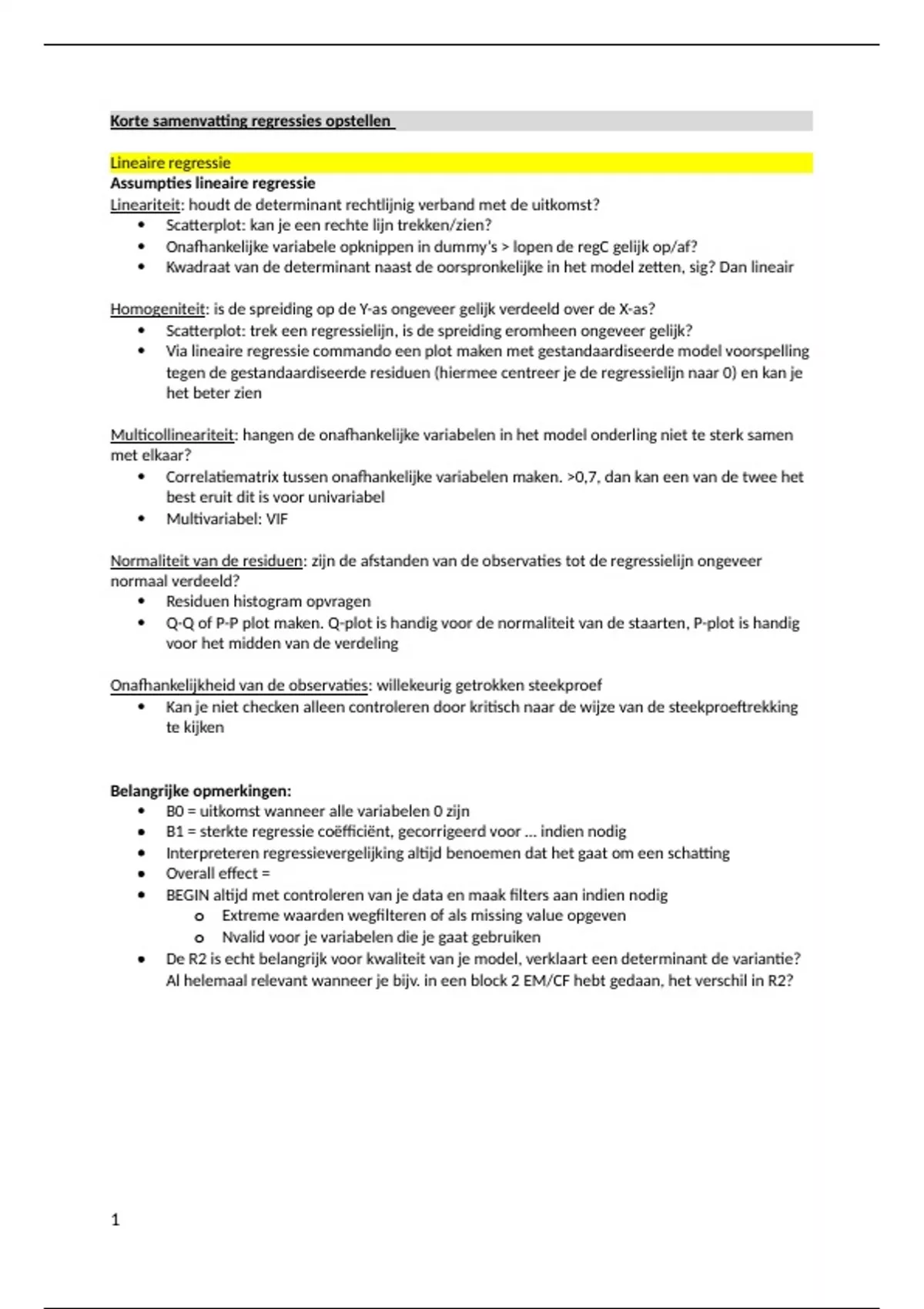 Dit is een samenvatting van verschillende regressie analyse methoden van MTB, 8,9 op het tentamen behaald.. Het is een hulpmiddel om de regressies beter te begrijpen. Het is een beknopte samenvatting waarin de stappen per analyse, in bulletpoints zijn weergegeven voor de overzichtelijkheid per stap. De samenvatting is vooral gericht op de output van SPSS, welke informatie het belangrijkste is per analyse, om de regressie in zijn geheel te begrijpen en juist te interpreteren. De volgende onderwerpen zijn uitgewerkt 1. Lineaire regressie; assumpties controleren in SPSS, output bivariate lineaire regressie in SPSS 2. multipele lineaire regressie; SPSS associatiemodel (effectmodificatie en confounding), SPSS predictie model (verschil backward en forward methode) 3. chi kwadraat: assumpties, Chi in SPSS met output interpreteren 4. logistische regressie; assumpties, LogR draaien in SPSS, output tabellen begrijpen, interpretatie logistische regressievergelijking, stappenplan LN(odds) terugrekenen naar odds en kansen, kwaliteit beoordelen, continue determinant waarvan lineariteit moet worden beoordeeld adhv dummy's