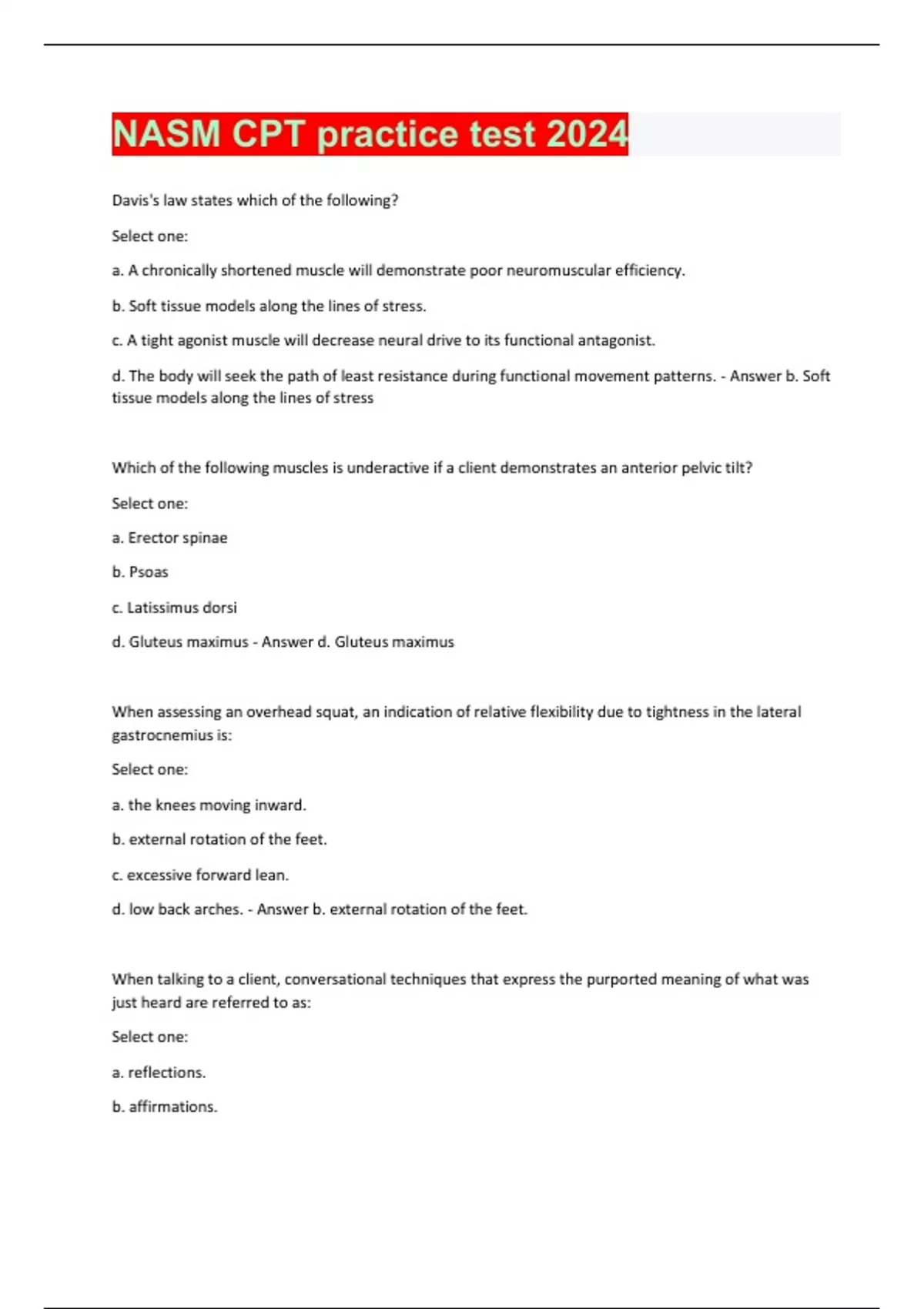 Davis's law states which of the following? Select one: a. A chronically shortened muscle will demonstrate poor neuromuscular efficiency. b. Soft tissue models along the lines of stress. c. A tight agonist muscle will decrease neural drive to its functional antagonist. d. The body will seek the path of least resistance during functional movement patterns. - Answer b. Soft tissue models along the lines of stress Which of the following muscles is underactive if a client demonstrates an anterior pelvic tilt? Select one: a. Erector spinae b. Psoas c. Latissimus dorsi d. Gluteus maximus - Answer d. Gluteus maximus When assessing an overhead squat, an indication of relative flexibility due to tightness in the lateral gastrocnemius is: Select one: a. the knees moving inward. b. external rotation of the feet. c. excessive forward lean. d. low back arches. - Answer b. external rotation of the feet. When talking to a client, conversational techniques that express the purported meaning of what was just heard are referred to as: Select one: a. reflections. b. affirmations.c. compliments. d. judgments. - Answer a. reflections. Which of the following best describes the code of conduct for a fitness professional? Select one: a. A set of scientifically proven and evidence-based theories that a fitness professional can apply to specific fitness programs. b. Guidelines to ensure that all professionals provide the highest level of service and respect for all colleagues, allied professionals, and the general public. c. A set of processes that help a fitness professional determine the number of clients he or she can handle at a given. time d. A set of records that allow a fitness professional to track his or her own progress career-wise. - Answer b. Guidelines to ensure that all professionals provide the highest level of service and respect for all colleagues, allied professionals, and the general public. Which of the following is a sign that a client has completed an accurate one-rep maximum bench press estimation test? Select one: a. Your client fails after 8-12 repetitions. b. Your client fails after 1 repetition. c. Your client fails at 3 to 5 repetitions. d. Your client fails right before their arms straighten. - Answer c. Your client fails at 3 to 5 repetitions. Which of the following is an example of a strength level resistance training exercise for legs? Select one: a. Multiplanar step-up to balance b. Single-leg squat c. Single-leg dead lift d. Multiplanar dumbbell step-up Feedback - Answer d. Multiplanar dumbbell step-up