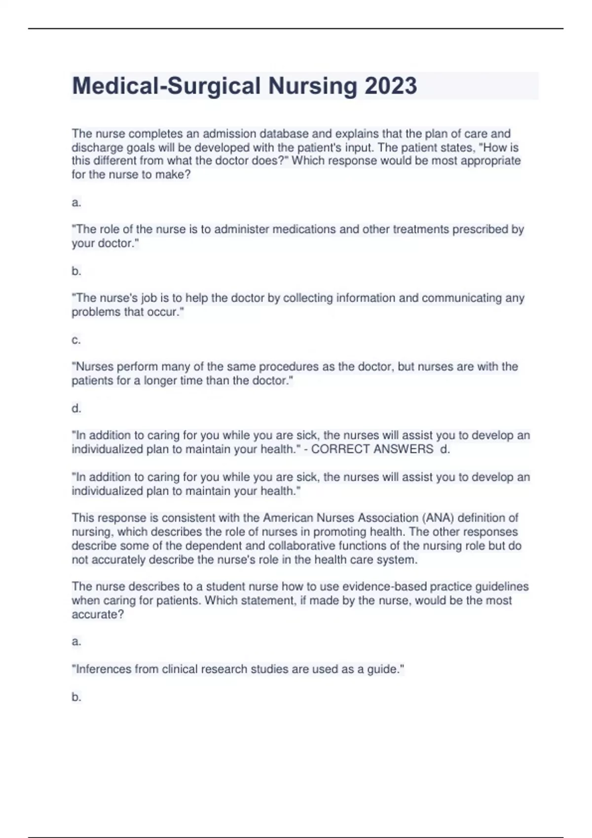 Medical-Surgical Nursing 2023 The nurse completes an admission database and explains that the plan of care and discharge goals will be developed with the patient's input. The patient states, "How is this different from what the doctor does?" Which response would be most appropriate for the nurse to make? a. "The role of the nurse is to administer medications and other treatments prescribed by your doctor." b. "The nurse's job is to help the doctor by collecting information and communicating any problems that occur." c. "Nurses perform many of the same procedures as the doctor, but nurses are with the patients for a longer time than the doctor." d. "In addition to caring for you while you are sick, the nurses will assist you to develop an individualized plan to maintain your health." - CORRECT ANSWERS d. "In addition to caring for you while you are sick, the nurses will assist you to develop an individualized plan to maintain your health." This response is consistent with the American Nurses Association (ANA) definition of nursing, which describes the role of nurses in promoting health. The other responses describe some of the dependent and collaborative functions of the nursing role but do not accurately describe the nurse's role in the health care system. The nurse describes to a student nurse how to use evidence-based practice guidelines when caring for patients. Which statement, if made by the nurse, would be the most accurate? a. "Inferences from clinical research studies are used as a guide." b. "Patient care is based on clinical judgment, experience, and traditions." c. "Data are evaluated to show that the patient outcomes are consistently met." d. "Recommendations are based on research, clinical expertise, and patient preferences." - CORRECT ANSWERS d. "Recommendations are based on research, clinical expertise, and patient preferences." Evidence-based practice (EBP) is the use of the best research-based evidence combined with clinician expertise. Clinical judgment based on the nurse's clinical experience is part of EBP, but clinical decision making should also incorporate current research and research-based guidelines. Evaluation of patient outcomes is important, but interventions should be based on research from randomized control studies with a large number of subjects. The nurse teaches a student nurse about how to apply the nursing process when providing patient care. Which statement, if made by the student nurse, indicates that teaching was successful? a. "The nursing process is a scientific-based method of diagnosing the patient's health care problems." b. "The nursing process is a problem-solving tool used to identify and treat patients' health care needs." c. "The nursing process is based on nursing theory that incorporates the biopsychosocial nature of humans." d. "The nursing process is used primarily to explain nursing interventions to other health care professionals." - CORRECT ANSWERS b. "The nursing process is a problem-solving tool used to identify and treat patients' health care needs." The nursing process is a problem-solving approach to the identification and treatment of patients' problems. Diagnosis is only one phase of the nursing process. The primary use of the nursing process is in patient care, not to establish nursing theory or explain nursing interventions to other health care professionals. A patient has been admitted to the hospital for surgery and tells the nurse, "I do not feel comfortable leaving my children with my parents." Which action should the nurse take next? a. Reassure the patient that these feelings are common for parents. b. Have the patient call the children to ensure that they are doing well. c. Gather more data about the patient's feelings about the child-care arrangements. d. Call the patient's parents to determine whether adequate child care is being provided. - CORRECT ANSWERS c. Gather more data about the patient's feelings about the child-care arrangements. Since a complete assessment is necessary in order to identify a problem and choose an appropriate intervention, the nurse's first action should be to obtain more information. The other actions may be appropriate, but more assessment is needed before the best intervention can be chosen. A patient who is paralyzed on the left side of the body after a stroke develops a pressure ulcer on the left hip. Which nursing diagnosis is m