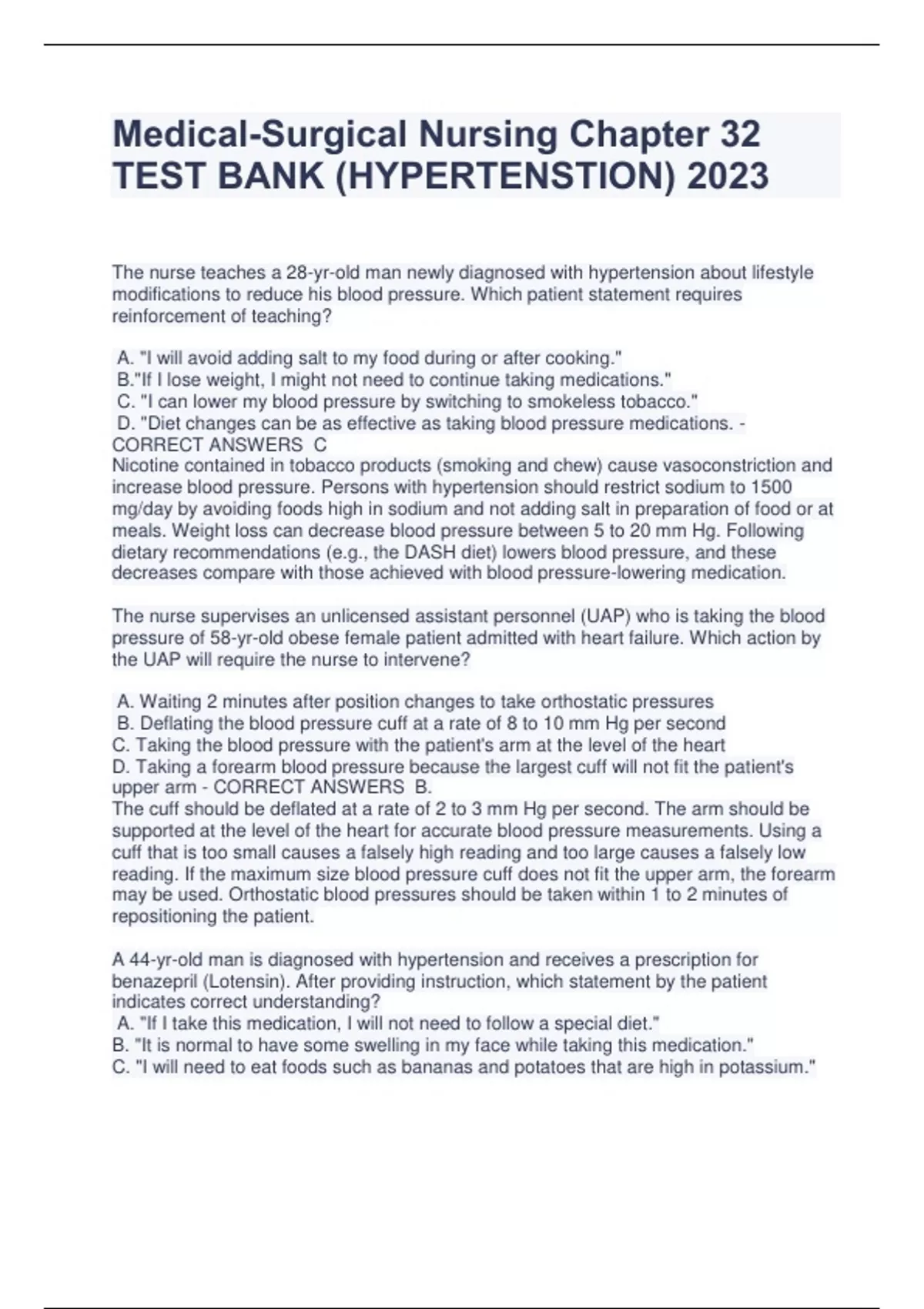 Medical-Surgical Nursing Chapter 32 TEST BANK (HYPERTENSTION) 2023 The nurse teaches a 28-yr-old man newly diagnosed with hypertension about lifestyle modifications to reduce his blood pressure. Which patient statement requires reinforcement of teaching? A. "I will avoid adding salt to my food during or after cooking." B."If I lose weight, I might not need to continue taking medications." C. "I can lower my blood pressure by switching to smokeless tobacco." D. "Diet changes can be as effective as taking blood pressure medications. - CORRECT ANSWERS C Nicotine contained in tobacco products (smoking and chew) cause vasoconstriction and increase blood pressure. Persons with hypertension should restrict sodium to 1500 mg/day by avoiding foods high in sodium and not adding salt in preparation of food or at meals. Weight loss can decrease blood pressure between 5 to 20 mm Hg. Following dietary recommendations (e.g., the DASH diet) lowers blood pressure, and these decreases compare with those achieved with blood pressure-lowering medication. The nurse supervises an unlicensed assistant personnel (UAP) who is taking the blood pressure of 58-yr-old obese female patient admitted with heart failure. Which action by the UAP will require the nurse to intervene? A. Waiting 2 minutes after position changes to take orthostatic pressures B. Deflating the blood pressure cuff at a rate of 8 to 10 mm Hg per second C. Taking the blood pressure with the patient's arm at the level of the heart D. Taking a forearm blood pressure because the largest cuff will not fit the patient's upper arm - CORRECT ANSWERS B. The cuff should be deflated at a rate of 2 to 3 mm Hg per second. The arm should be supported at the level of the heart for accurate blood pressure measurements. Using a cuff that is too small causes a falsely high reading and too large causes a falsely low reading. If the maximum size blood pressure cuff does not fit the upper arm, the forearm may be used. Orthostatic blood pressures should be taken within 1 to 2 minutes of repositioning the patient. A 44-yr-old man is diagnosed with hypertension and receives a prescription for benazepril (Lotensin). After providing instruction, which statement by the patient indicates correct understanding? A. "If I take this medication, I will not need to follow a special diet." B. "It is normal to have some swelling in my face while taking this medication." C. "I will need to eat foods such as bananas and potatoes that are high in potassium." D. "If I develop a dry cough while taking this medication, I should notify my doctor." - CORRECT ANSWERS D. Benazepril is an angiotensin-converting enzyme inhibitor. The medication inhibits breakdown of bradykinin, which may cause a dry, hacking cough. Other adverse effects include hyperkalemia. Swelling in the face could indicate angioedema and should be reported immediately to the prescriber. Patients taking drug therapy for hypertension should also attempt lifestyle modifications to lower blood pressure such as a reducedsodium diet. A 67-yr-old woman with hypertension is admitted to the emergency department with a blood pressure of 234/148 mm Hg and was started on nitroprusside (Nitropress). After one hour of treatment, the mean arterial blood pressure (MAP) is 55 mm Hg. Which nursing action is a priority? A. Start an infusion of 0.9% normal saline at 100 mL/hr. B. Maintain the current administration rate of the nitroprusside. C. Request insertion of an arterial line for accurate blood pressure monitoring. D. Stop the nitroprusside infusion and assess the patient for potential complications. - CORRECT ANSWERS D. Nitroprusside is a potent vasodilator medication. A blood pressure of 234/118 mm Hg would have a calculated MAP of 177 mm Hg. Subtracting 25% (or 44 mm Hg) = 133 mm Hg. The initial treatment goal is to decrease MAP by no more than 25% within minutes to 1 hour. For this patient, the goal MAP would be approximately 133 mm Hg. Minimal MAP required to perfuse organs is around 60 to 65 mm Hg. Lowering the blood pressure too rapidly may decrease cerebral, coronary, or renal perfusion and could precipitate a stroke, myocardial infarction, or renal failure. The priority is to stop the nitroprusside infusion and then use fluids only if necessary to support restoration of MAP. The nurse admits a 73-yr-old male patient with dementia for treatment of uncontrolled hypertension. The nurse will closely monitor for hypokalemia if the patient receives which medication? A. Clonidine (Catapres) B. Bumetanide (Bumex) C.Amiloride (Midamor) D. Spironolactone (Aldactone) - CORRECT ANSWERS B. Bumetanide is a loop diuretic. Hypokalemia is a common adverse effect of this medication. Amiloride is a potassium-sparing diuretic. Spironolactone is an aldosterone- receptor blocker. Hyperkalemia is an adverse effect of both amiloride and spironolactone. Clonidine is a central-acting α-adrenergic antagonist and does not cause electrolyte abnormalities. The nurse teaches a patient with hypertension that uncontrolled hypertension may damage organs in the body primarily by which mechanism? A. Hypertension promotes atherosclerosis and damage to the walls of the arteries. B. Hypertension causes direct pressure on organs, resulting in necrosis and replacement of cells with scar tissue. C. Hypertension causes thickening of the capillary membranes, leading to hypoxia of organ systems. D. Hypertension increases blood viscosity, which contributes to intravascular coagulation and tissue necrosis distal to occlusions. - CORRECT ANSWERS A. Hypertension is a major risk factor for the development of atherosclerosis by mechanisms not yet fully known. However, when atherosclerosis develops, it damages the walls of arteries and reduces circulation to target organs and tissues. When teaching a patient about dietary management of stage 1 hypertension, which instruction is most appropriate? A. Increase water intake. B. Restrict sodium intake. C. Increase protein intake. D