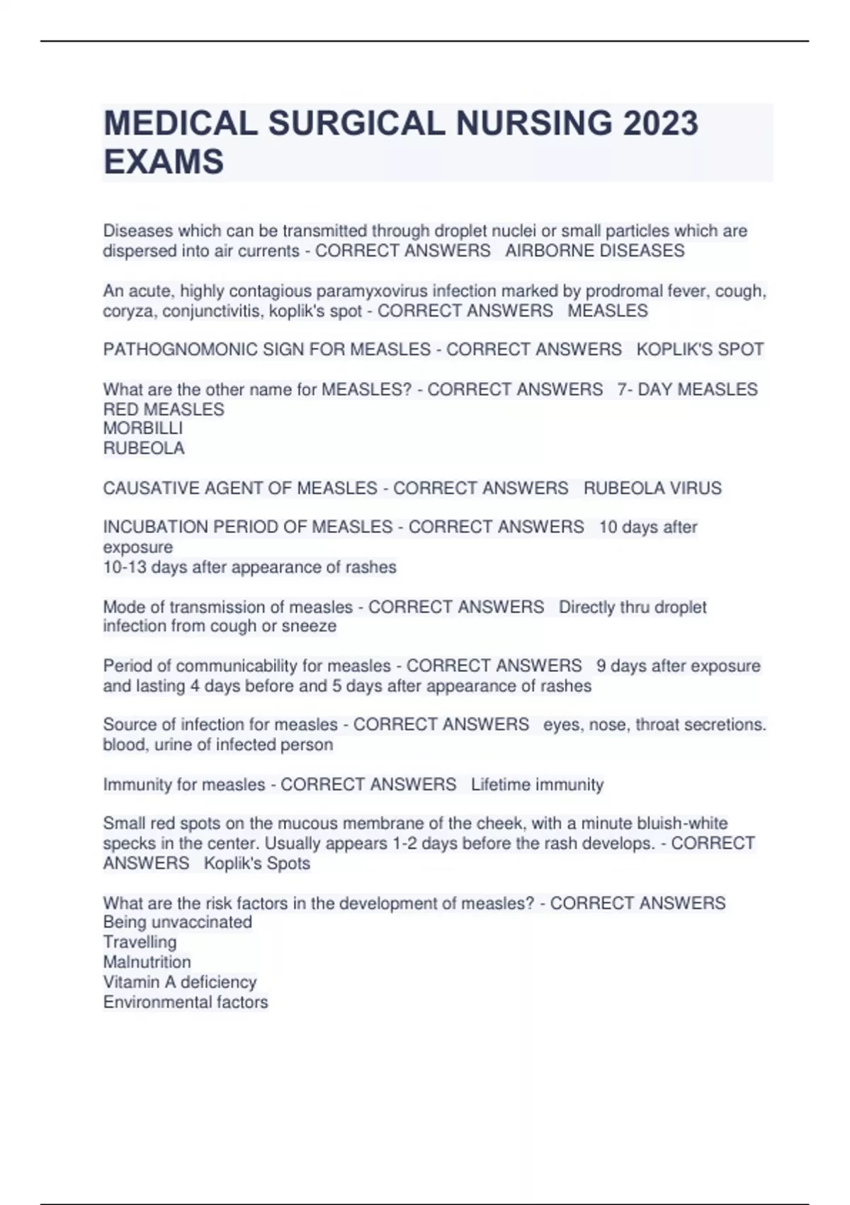 MEDICAL SURGICAL NURSING 2023 EXAMS Diseases which can be transmitted through droplet nuclei or small particles which are dispersed into air currents - CORRECT ANSWERS AIRBORNE DISEASES An acute, highly contagious paramyxovirus infection marked by prodromal fever, cough, coryza, conjunctivitis, koplik's spot - CORRECT ANSWERS MEASLES PATHOGNOMONIC SIGN FOR MEASLES - CORRECT ANSWERS KOPLIK'S SPOT What are the other name for MEASLES? - CORRECT ANSWERS 7- DAY MEASLES RED MEASLES MORBILLI RUBEOLA CAUSATIVE AGENT OF MEASLES - CORRECT ANSWERS RUBEOLA VIRUS INCUBATION PERIOD OF MEASLES - CORRECT ANSWERS 10 days after exposure 10-13 days after appearance of rashes Mode of transmission of measles - CORRECT ANSWERS Directly thru droplet infection from cough or sneeze Period of communicability for measles - CORRECT ANSWERS 9 days after exposure and lasting 4 days before and 5 days after appearance of rashes Source of infection for measles - CORRECT ANSWERS eyes, nose, throat secretions. blood, urine of infected person Immunity for measles - CORRECT ANSWERS Lifetime immunity Small red spots on the mucous membrane of the cheek, with a minute bluish-white specks in the center. Usually appears 1-2 days before the rash develops. - CORRECT ANSWERS Koplik's Spots What are the risk factors in the development of measles? - CORRECT ANSWERS Being unvaccinated Travelling Malnutrition Vitamin A deficiency Environmental factors Immunosuppression It is a stage where measles is highly communicable? - CORRECT ANSWERS Preeruptive stage Puffiness of the eyelids with red linear congestion of the lower conjunctiva - CORRECT ANSWERS Stimson's sign 3 C'S IN MEASLES - CORRECT ANSWERS Conjunctivitis Cough Coryza A stage where there is the appearance of rashes in measles - CORRECT ANSWERS Eruptive stage What is the appearance of rashes in the measles - CORRECT ANSWERS MACULOPAPULAR RASH How is the rashes in measles appear? - CORRECT ANSWERS EXPOSEDUNEXPOSED (CENTRIPETAL) T/F: Rashes increases when fever increases and fever falls when rashes disappear - CORRECT ANSWERS True OTHER MANIFESTATIONS OF MEASLES - CORRECT ANSWERS Anorexia Diarrhea Sore Throat Severe cough T/F: rashes fades as the same manner they appeared. - CORRECT ANSWERS True Quickes mathod of confirming acute measles - CORRECT ANSWERS Antibody assay test Highly sensitive in visualizing measles - CORRECT ANSWERS Reverse-transcriptase polymerase chin reaction PREVENTIVE MEASURES IN MEASLES - CORRECT ANSWERS Measle vaccine @ 9 mos. MMR vaccine @ 15 mos. second dose is 11-12 y/o T/F: Measles should not be given with pregnant women and with depresses immune system. - CORRECT ANSWERS True POSSIBLE COMPLICATIONS FOR MEASLES - CORRECT ANSWERS Pneumonia