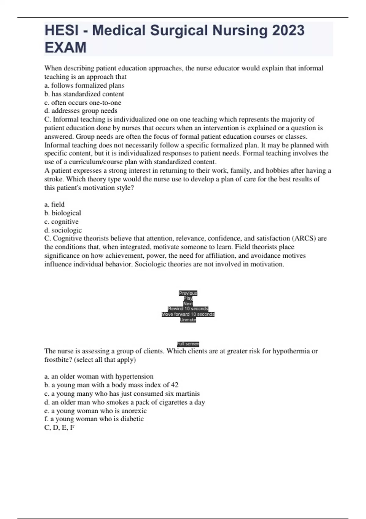 HESI - Medical Surgical Nursing 2023 EXAM When describing patient education approaches, the nurse educator would explain that informal teaching is an approach that a. follows formalized plans b. has standardized content c. often occurs one-to-one d. addresses group needs C. Informal teaching is individualized one on one teaching which represents the majority of patient education done by nurses that occurs when an intervention is explained or a question is answered. Group needs are often the focus of formal patient education courses or classes. Informal teaching does not necessarily follow a specific formalized plan. It may be planned with specific content, but it is individualized responses to patient needs. Formal teaching involves the use of a curriculum/course plan with standardized content. A patient expresses a strong interest in returning to their work, family, and hobbies after having a stroke. Which theory type would the nurse use to develop a plan of care for the best results of this patient's motivation style? a. field b. biological c. cognitive d. sociologic C. Cognitive theorists believe that attention, relevance, confidence, and satisfaction (ARCS) are the conditions that, when integrated, motivate someone to learn. Field theorists place significance on how achievement, power, the need for affiliation, and avoidance motives influence individual behavior. Sociologic theories are not involved in motivation. Brainpower Read More Previous Play Next Rewind 10 seconds Move forward 10 seconds Unmute 0:00 / 0:00 Full screen The nurse is assessing a group of clients. Which clients are at greater risk for hypothermia or frostbite? (select all that apply) a. an older woman with hypertension b. a young man with a body mass index of 42 c. a young many who has just consumed six martinis d. an older man who smokes a pack of cigarettes a day e. a young woman who is anorexic f. a young woman who is diabetic C, D, E, F HESI - Medical Surgical Nursing 2023 EXAM clients with poor nutrition, fatigue, and multiple chronic illnesses are at greater risk for hypothermia. Clients who smoke, consume alcohol, or have impaired peripheral circulation have a higher incidence of frostbite. Which statement made by a nurse represents the need for further education regarding pain management in older adult clients? a. older adults tend to report pain less often than younger adults b. older clients usually have more experience with pain than younger clients c. older adults are at greatest risk for under treated pain d. older clients have a different pain mechanism and do not feel it as much D There is no evidence to support the idea that older adult clients perceive pain any differently than younger clients. The other statements are accurate regarding older clients and pain. We have an expert-written solution to this problem! The nurse is working at a first aid booth for a spring training game on a hot day. A spectator comes in, reporting that he is not feeling well. Vital signs are temp 104.1 F, pulse 132 BPM, respirs 26 breaths/min, and blood pressure 106/66 mm Hg. He trips over his feet as the nurse leads him to a cot. What is the priory action of the nurse? a. admin tylenol 650 mg orally b. encourage rest, and reassess in 15 minutes c. sponge the victim with cool water and remove his shirt d. encourage drinking of cool water or sports drink C The spectator shows signs of heat stroke, which is a medical emergency. The spectator should be transported to the ED ASAP. The nurs should take actions to lower his body temp in teh meantime by removing his shirt and sponging his body with cool water. Lowering body temp by drinking cool fluids or taking acetaminophen is not as effective in an emergency situation. The client needs to be cooled quickly and is a priority for treatment The client is receiving an IV of 60 mEq of potassium chloride ina 1000 mL solution of dextrose 5% in 0.45% saline. The client states that the area around the IV site burns. What intervention does the nurse perform first? a. assess for a blood return b. notify the physician c. document the finding d. stop the IV infusion D Potassium is a severe tissue irritant. The safest action is to discontinue the solution that contains HESI - Medical Surgical Nursing 2023 EXAM the potassium and discontinue the IV altogether, in which case the client would need another site started. Assessing for a blood return may or may not be successful. The solution could be diluted (less potassium) and the rate could be slowed once it is determined that the needle is in the vein. A nurse is caring for an older adult client who lives alone. Which economic situation presents the most serious problem for this client? a. costs of creating a living will b. stock market fluctuations c. increased provider benefits d. social security as the basis of income D Older adults on fixed incomes are unable to adjust their income to meet rising costs associated with meeting basic needs Controlling pain is important to promoting wellness. Unrelieved pain has been associated with a. prolonged stress response and a cascade of harmful effects system wide. b. decreased tumor growth and longevity c. large tidal volumes and decreased lung capacity d. decreased carbohydrate, protein, and fat destruction A Pain triggers a number of physiologic stress responses in the human body. Unrelieved pain can prolong the stress response and produce a cascade of harmful