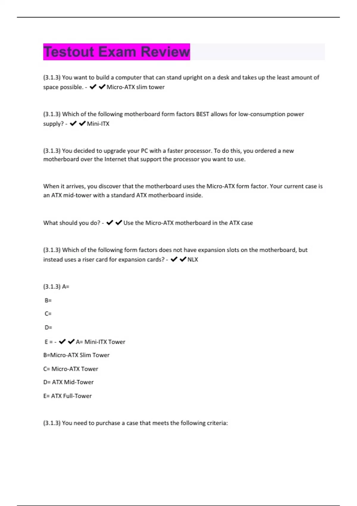 (3.1.3) You want to build a computer that can stand upright on a desk and takes up the least amount of space possible. - Micro-ATX slim tower (3.1.3) Which of the following motherboard form factors BEST allows for low-consumption power supply? - Mini-ITX (3.1.3) You decided to upgrade your PC with a faster processor. To do this, you ordered a new motherboard over the Internet that support the processor you want to use. When it arrives, you discover that the motherboard uses the Micro-ATX form factor. Your current case is an ATX mid-tower with a standard ATX motherboard inside. What should you do? - Use the Micro-ATX motherboard in the ATX case (3.1.3) Which of the following form factors does not have expansion slots on the motherboard, but instead uses a riser card for expansion cards? - NLX (3.1.3) A= B= C= D= E = - A= Mini-ITX Tower B=Micro-ATX Slim Tower C= Micro-ATX Tower D= ATX Mid-Tower E= ATX Full-Tower (3.1.3) You need to purchase a case that meets the following criteria:Compatible with most form factors At least two external and internal bays Good balance of size and space - ATX mid-tower (3.1.3) You work as the IT administrator for a small corporate network. One of the company employees needs to add an additional PCI card to the motherboard. When you open the computer, you see that the card purchased will not fit due to the cards height. Which of the following is the BEST method for using the newly purchased card? - Use a riser card to allow the new card to be installed parallel to the motherboard (3.2.6) A computers power supply converts mains AC to low-voltage regulated DC power for the internal components of a computer. You are building a new computer. You are deciding which type of power supply to install. Which of the following definitions BEST describes a valid type of power supply? - A dual-rail power supply provides separate rails (PCB traces) used to balance the power load between multiple circuits, which prevents any one circuit from becoming overloaded. (3.2.6) You need to replace the power supply in your home desktop computer. As you choose the replacement power supply, which of the following specifications are the most likely to affect your choice? - Output wattage Form factor Processor connector (3.2.6) You have a desktop computer that you want to upgrade. You add several internal components and external components. You realize that you need to ensure that your power supply can support all of the new devices. - Which power supply rating is used to determine this?Watt rating