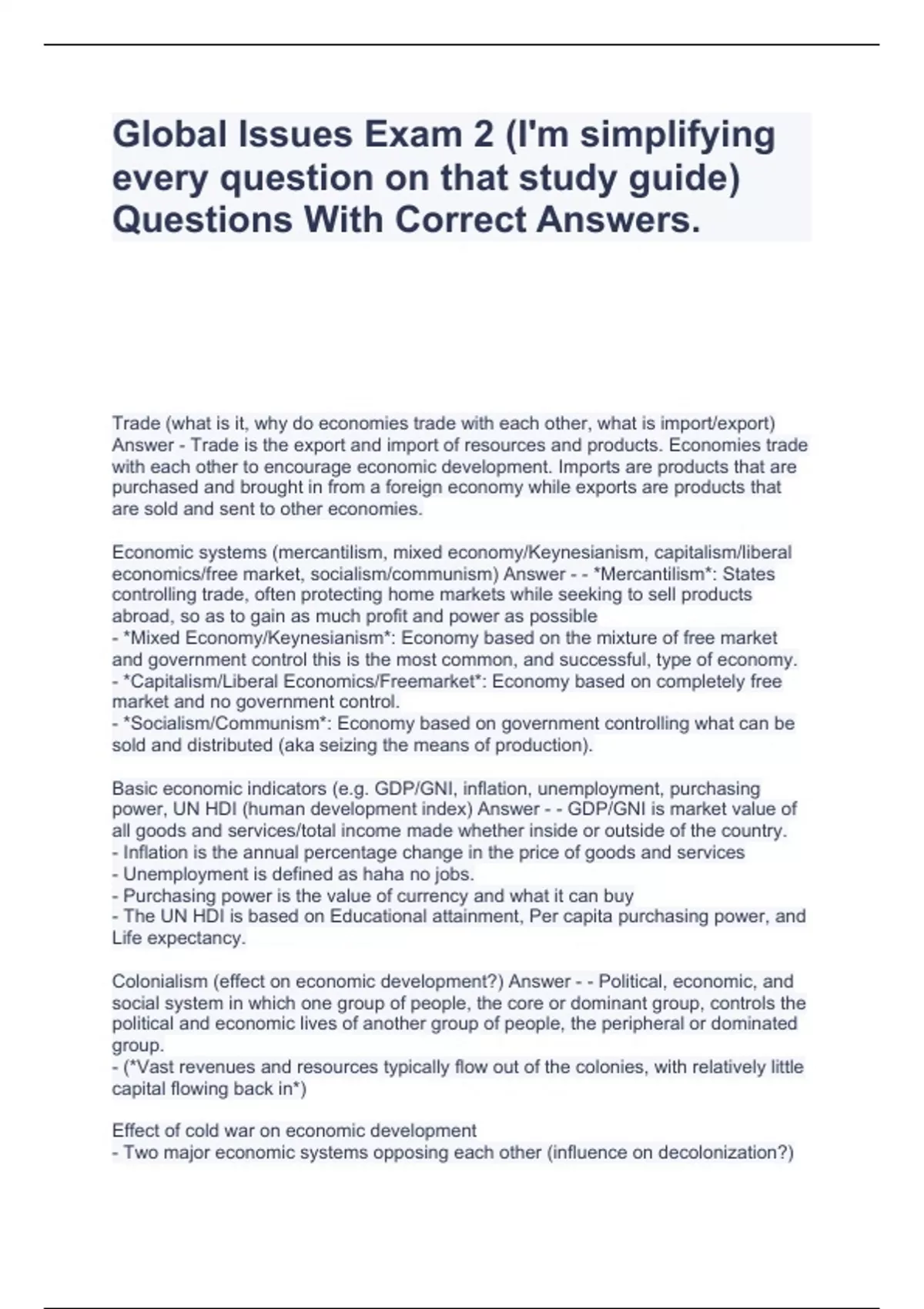 Global Issues Exam 2 (I'm simplifying every question on that study guide) Questions With Correct Answers.