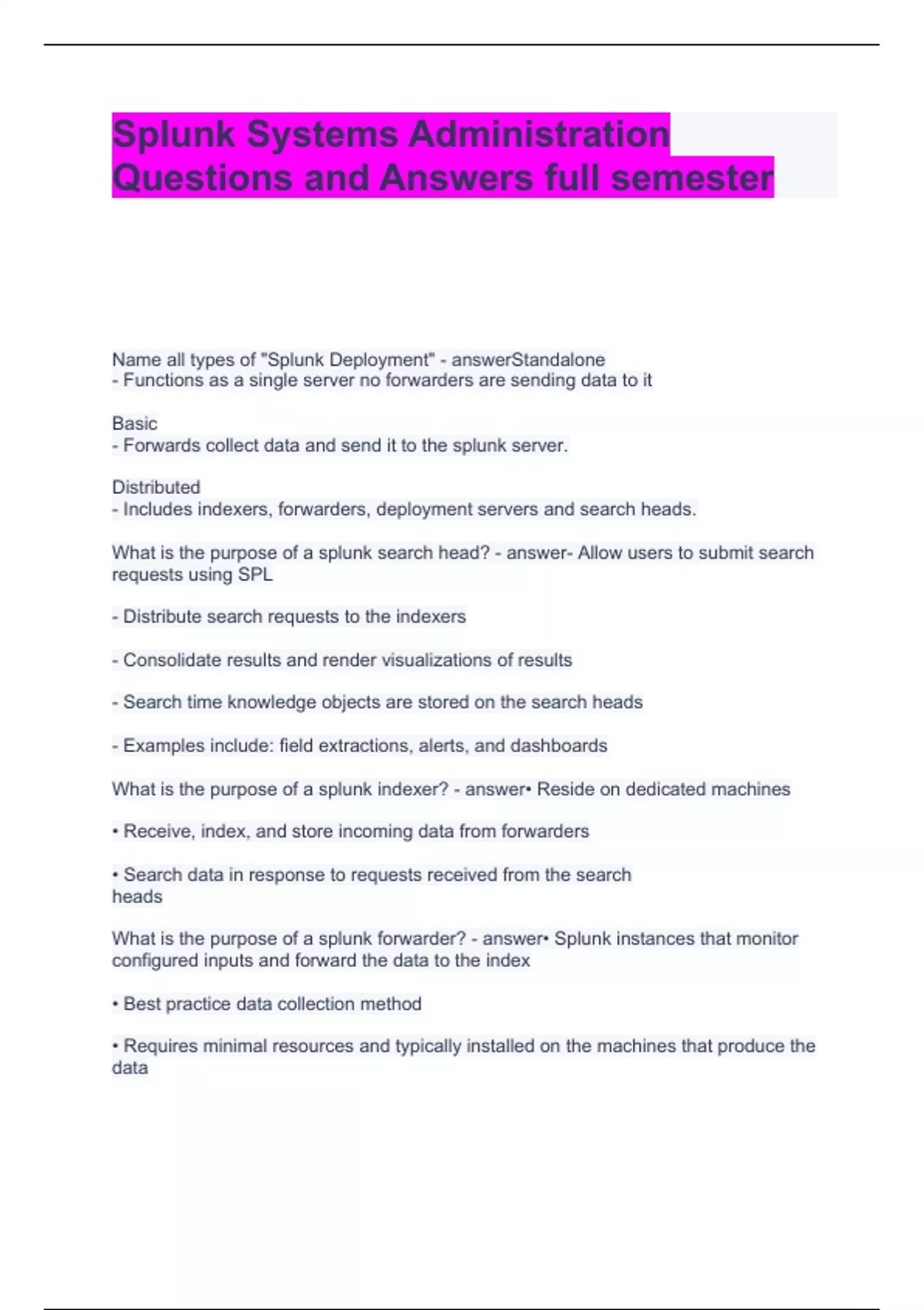 Splunk Systems Administration Questions and Answers full semester Name all types of "Splunk Deployment" Standalone - Functions as a single server no forwarders are sending data to it Basic - Forwards collect data and send it to the splunk server. Distributed - Includes indexers, forwarders, deployment servers and search heads. What is the purpose of a splunk search head? - Allow users to submit search requests using SPL - Distribute search requests to the indexers - Consolidate results and render visualizations of results - Search time knowledge objects are stored on the search heads - Examples include: field extractions, alerts, and dashboards Brainpower Read More Previous Play Next Rewind 10 seconds Move forward 10 seconds Unmute 0:00 / 0:15 Full screen What is the purpose of a splunk indexer? • Reside on dedicated machines • Receive, index, and store incoming data from forwarders • Search data in response to requests received from the search heads What is the purpose of a splunk forwarder? • Splunk instances that monitor configured inputs and forward the data to the index • Best practice data collection method • Requires minimal resources and typically installed on the machines that produce the data What is Included in the Splunk Enterprise software package? - indexer -search head -license master -deployment server - heavy forwarder - master node True or False Splunk on *NIX does not auto-start at boot time True Should you run splunk as super user? No, do not run Splunk as super-user! How should you set up Time Synchronization? Use a time synchronization service such as NTP What port does "splunkd" use in Splunk Enterprise? 8089 What port does "Splunk Web" use in Splunk Enterprise? 8000 What port does "Web app-server proxy" use in Splunk Enterprise? 8065 What port does "KV Store" use in Splunk Enterprise? 8191 What port does "splunkd" use in Universal Forwarder? 8089 When setting splunk up on linux what are some basic recommendations? Increase ulimit settings - The following OS parameters need to be increased to allow for a large number of buckets/forwarders/users - Turn Transparent Huge Pages (THP) off on Splunk Enterprise servers What is the recommended hardware to use when setting up an Indexer? Memory 12 GB RAM CPU 12 CPU cores Running at 2+ GHz Disk Disk subsystem capable of 800 IOPS RAID 10 Network 1Gb Ethernet NIC Optional second NIC for a management network What is the recommended hardware to use when setting up an Search Head? Memory 12 GB RAM CPU 4 CPUs, quad-core per CPU Running at 2+ GHz Disk 2 x 10K RPM 300GB SAS drives - RAID 1 Network 1Gb Ethernet NIC Optional second NIC for a management network What is splunkd used for? Spawns and controls Splunk child processes (helpers) - Splunk Web proxy, KV store, and Introspection services - Each search, scripted input, or scripted alert • Accesses, processes, and indexes incoming data • Handles all search requests and returns results What is Splunk Web used for? Splunk Web is browser-based user interface - Provides both a search and management front end for splunkd process When using the splunk CLI (executable command in the bin directory) what does "splunk help" do? Display a usage summary When using the splunk CLI (executable command in the bin directory) what does "splunk help object" do? Display the details of a specific object When using the splunk CLI (executable command in the bin directory) what does "splunk [start | stop | restart]" do? Manages the Splunk processes When using the splunk CLI (executable command in the bin directory) what does "splunk start --accept-liscense]" do? Automatically accept the license without prompt When using the splunk CLI (executable command in the bin directory) what does "splunk status" do? Display the Splunk process status When using the splunk CLI (executable command in the bin directory) what does "splunk show splunkd-port" do? Show the port that the splunkd listens on When using the splunk CLI (executable command in the bin directory) what does "splunk show web-port" do? Show the port that Splunk Web listens on When using the splunk CLI (executable command in the bin directory) what does "splunk show servername" do? Show the servername of this instance When using the splunk CLI (executable command in the bin directory) what does "splunk show default-hostname" do? Show the default host name used for all data inputs What is the Monitoring Console (MC)? MC is a Splunk admin-only app used to monitor and investigate Splunk performance, resource usage, and more Which installer will you use to install the Search Head? Splunk Enterprise True or False. When you install Splunk on a Windows OS, you also have to configure the boot-start? False. You only need to do that on a Linux installation True or False. The default Splunk Web port is set to 8000. True. What are the Splunk License Types • Enterprise trial license - Downloads with product - Features same as Enterprise except for 500 MB per day limit - Only valid for 60 days, after which one of the other 3 license types must be activated - Sales trial license is a trial Enterprise license of varying size and duration • Enterprise license - Purchased from Splunk - Full functionality for indexing, search head, deployment server, etc. - Sets the daily indexing volume - No-enforcement license, allows users to keep searching even if you are in a license violation period • Free license - Disables alerts, authentication, clustering, distributed search, summarization, and forwarding to non-Splunk servers - Allows 500 MB/day of indexing and forwarding to other Splunk instances Forwarder license - Sets the server up as a heavy forwarder - Applies to non-indexing forwarders - Allows authentication, but no indexing If the indexing exceeds the allocated daily quota in a pool what happens? an alert is raised in Messages (pool warning) on any page in Splunk Web What Counts As Daily License Quota? • All data from all sources that is index