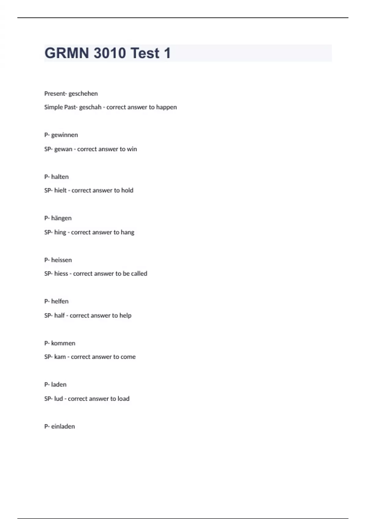 GRMN 3010 Test 1 Question and answers correctly solved 2023/2024Present- geschehen Simple Past- geschah - correct answer to happen P- gewinnen SP- gewan - correct answer to win