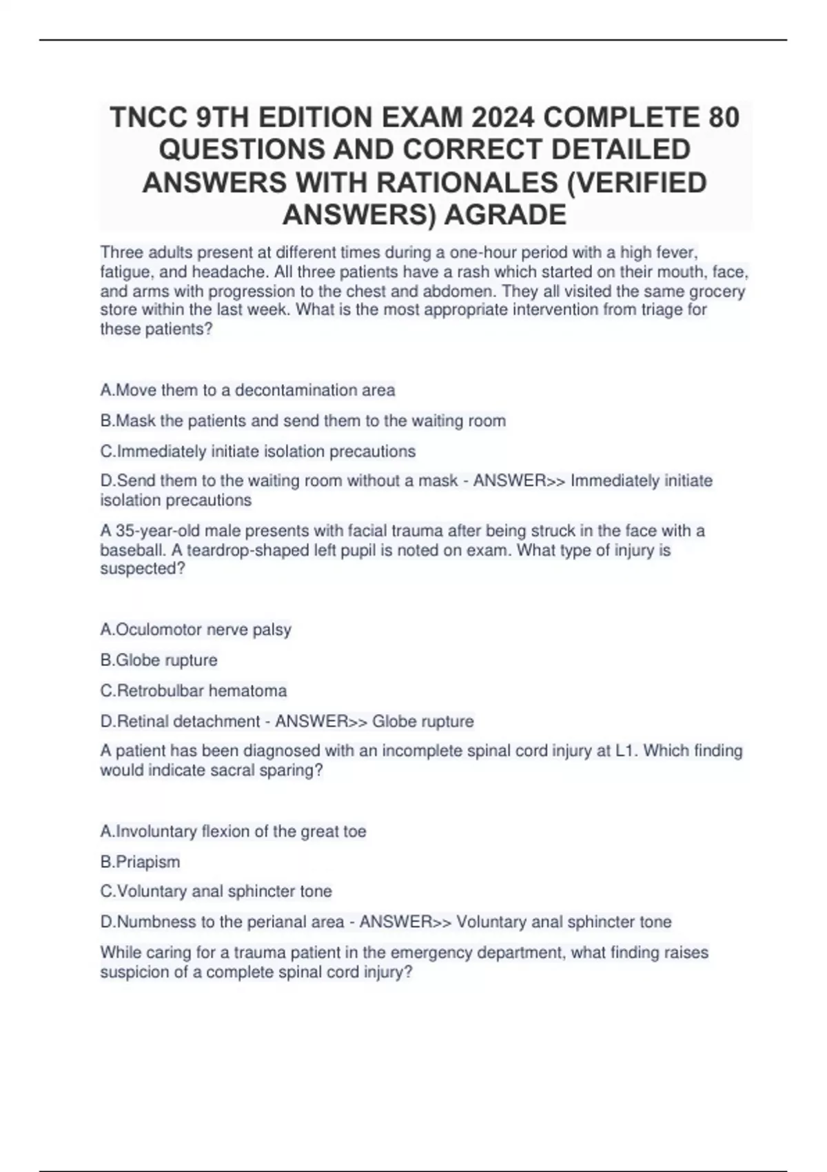 TNCC 9TH EDITION EXAM 2024 COMPLETE 80 QUESTIONS AND CORRECT DETAILED ANSWERS WITH RATIONALES