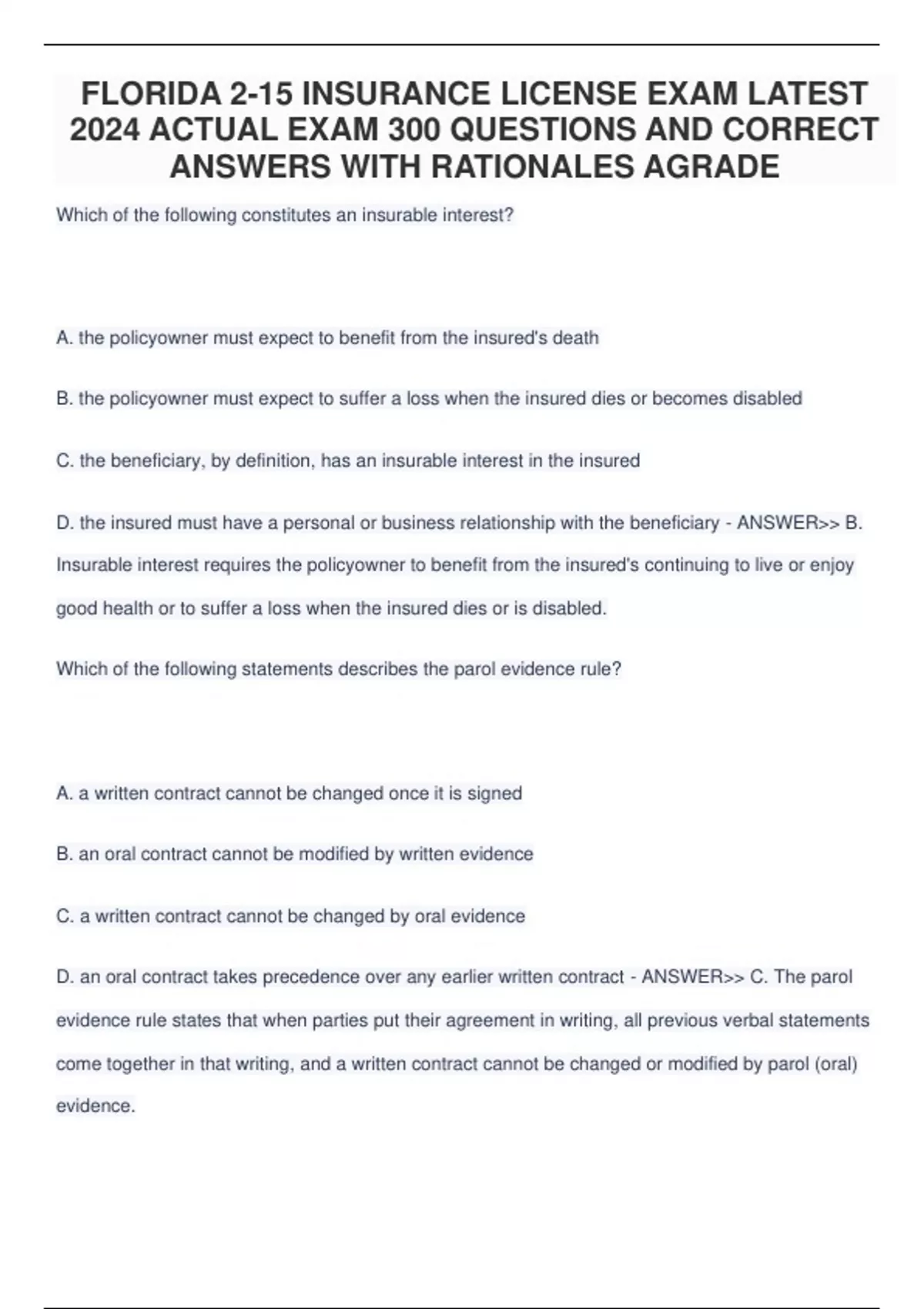 FLORIDA 2-15 INSURANCE LICENSE EXAM LATEST 2024 ACTUAL EXAM 300 QUESTIONS AND CORRECT ANSWERS AGRADE