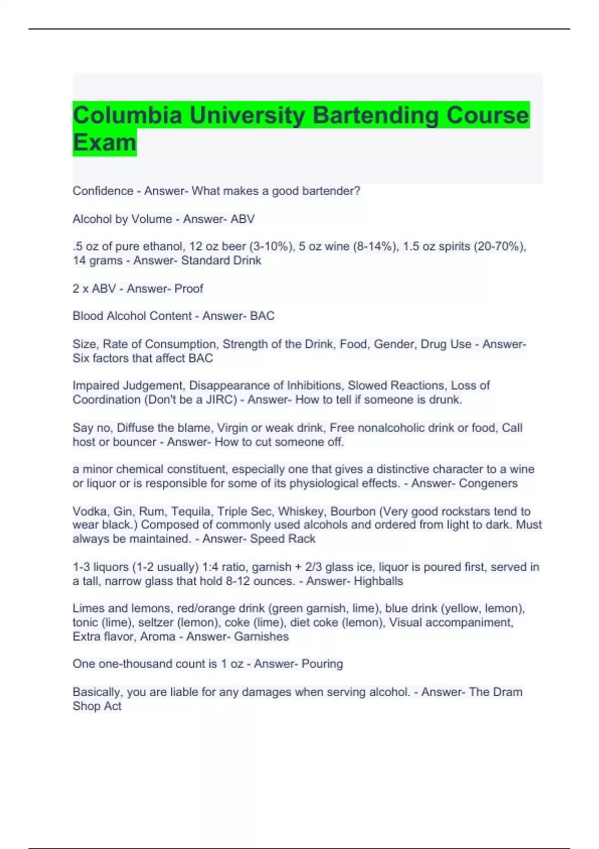 Columbia University Bartending Course Exam Questions and Answers