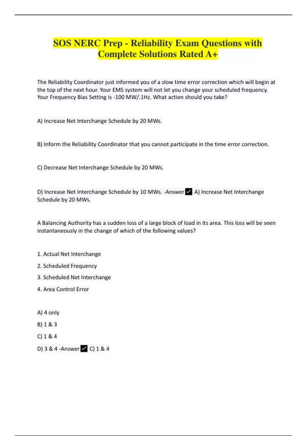 The Reliability Coordinator just informed you of a slow time error correction which will begin at the top of the next hour. Your EMS system will not let you change your scheduled frequency. Your Frequency Bias Setting is -100 MW/.1Hz. What action should you take? A) Increase Net Interchange Schedule by 20 MWs. B) Inform the Reliability Coordinator that you cannot participate in the time error correction. C) Decrease Net Interchange Schedule by 20 MWs. D) Increase Net Interchange Schedule by 10 MWs. -Answer A) Increase Net Interchange Schedule by 20 MWs. A Balancing Authority has a sudden loss of a large block of load in its area. This loss will be seen instantaneously in the change of which of the following values? 1. Actual Net Interchange 2. Scheduled Frequency 3. Scheduled Net Interchange 4. Area Control Error
