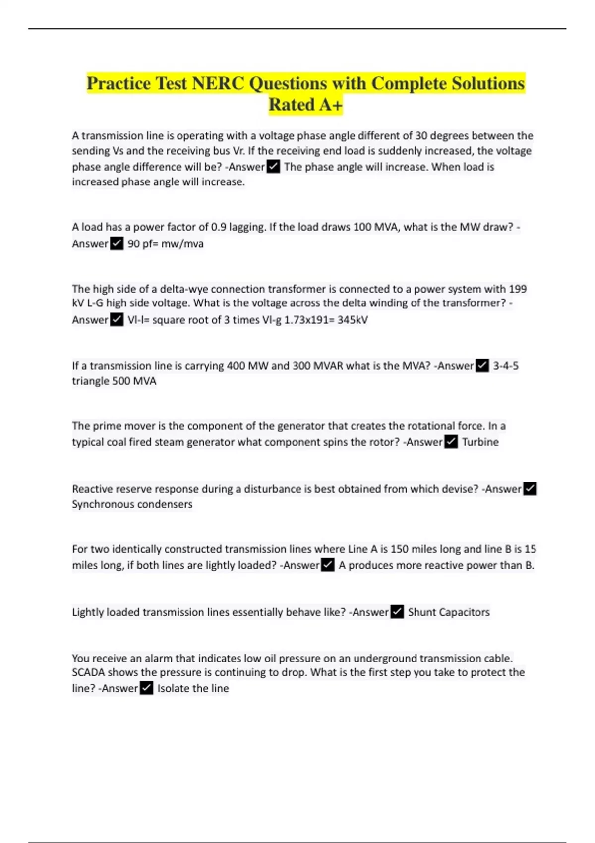 A transmission line is operating with a voltage phase angle different of 30 degrees between the sending Vs and the receiving bus Vr. If the receiving end load is suddenly increased, the voltage phase angle difference will be? -Answer The phase angle will increase. When load is increased phase angle will increase. A load has a power factor of 0.9 lagging. If the load draws 100 MVA, what is the MW draw? - Answer 90 pf= mw/mva The high side of a delta-wye connection transformer is connected to a power system with 199 kV L-G high side voltage. What is the voltage across the delta winding of the transformer? - Answer Vl-l= square root of 3 times Vl-g 1.73x191= 345kV If a transmission line is carrying 400 MW and 300 MVAR what is the MVA? -Answer 3-4-5 triangle 500 MVA The prime mover is the component of the generator that creates the rotational force. In a typical coal fired steam generator what component spins the rotor? -Answer Turbine Reactive reserve response during a disturbance is best obtained from which devise? -Answer Synchronous condensers For two identically constructed transmission lines where Line A is 150 miles long and line B is 15 miles long, if both lines are lightly loaded? -Answer A produces more reactive power than B. Lightly loaded transmission lines essentially behave like? -Answer Shunt Capacitors