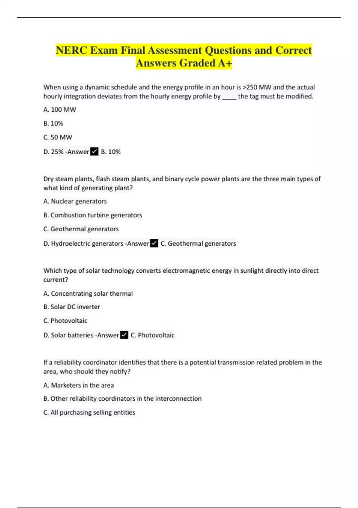 When using a dynamic schedule and the energy profile in an hour is >250 MW and the actual hourly integration deviates from the hourly energy profile by ____ the tag must be modified. A. 100 MW B. 10% C. 50 MW D. 25% -Answer B. 10% Dry steam plants, flash steam plants, and binary cycle power plants are the three main types of what kind of generating plant? A. Nuclear generators B. Combustion turbine generators C. Geothermal generators D. Hydroelectric generators -Answer C. Geothermal generators Which type of solar technology converts electromagnetic energy in sunlight directly into direct current? A. Concentrating solar thermal B. Solar DC inverter C. Photovoltaic D. Solar batteries -Answer C. Photovoltaic