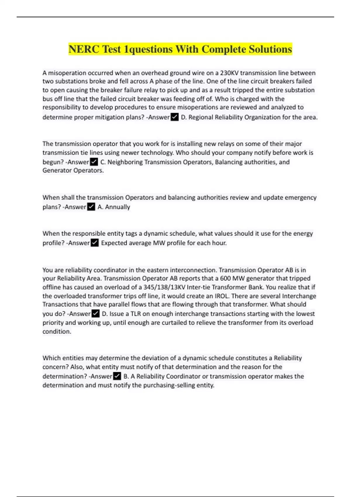 A misoperation occurred when an overhead ground wire on a 230KV transmission line between two substations broke and fell across A phase of the line. One of the line circuit breakers failed to open causing the breaker failure relay to pick up and as a result tripped the entire substation bus off line that the failed circuit breaker was feeding off of. Who is charged with the responsibility to develop procedures to ensure misoperations are reviewed and analyzed to determine proper mitigation plans? -Answer D. Regional Reliability Organization for the area. The transmission operator that you work for is installing new relays on some of their major transmission tie lines using newer technology. Who should your company notify before work is begun? -Answer C. Neighboring Transmission Operators, Balancing authorities, and Generator Operators. When shall the transmission Operators and balancing authorities review and update emergency plans? -Answer A. Annually When the responsible entity tags a dynamic schedule, what values should it use for the energy profile? -Answer Expected average MW profile for each hour. You are reliability coordinator in the eastern interconnection. Transmission Operator AB is in your Reliability Area. Transmission Operator AB reports that a 600 MW generator that tripped offline has caused an overload of a 345/138/13KV Inter-tie Transformer Bank. You realize that if the overloaded transformer trips off line, it would create an IROL. There are several Interchange Transactions that have parallel flows that are flowing through that transformer. What should you do? -Answer D. Issue a TLR on enough interchange transactions starting with the lowest priority and working up, until enough are curtailed to relieve the transformer from its overload condition.