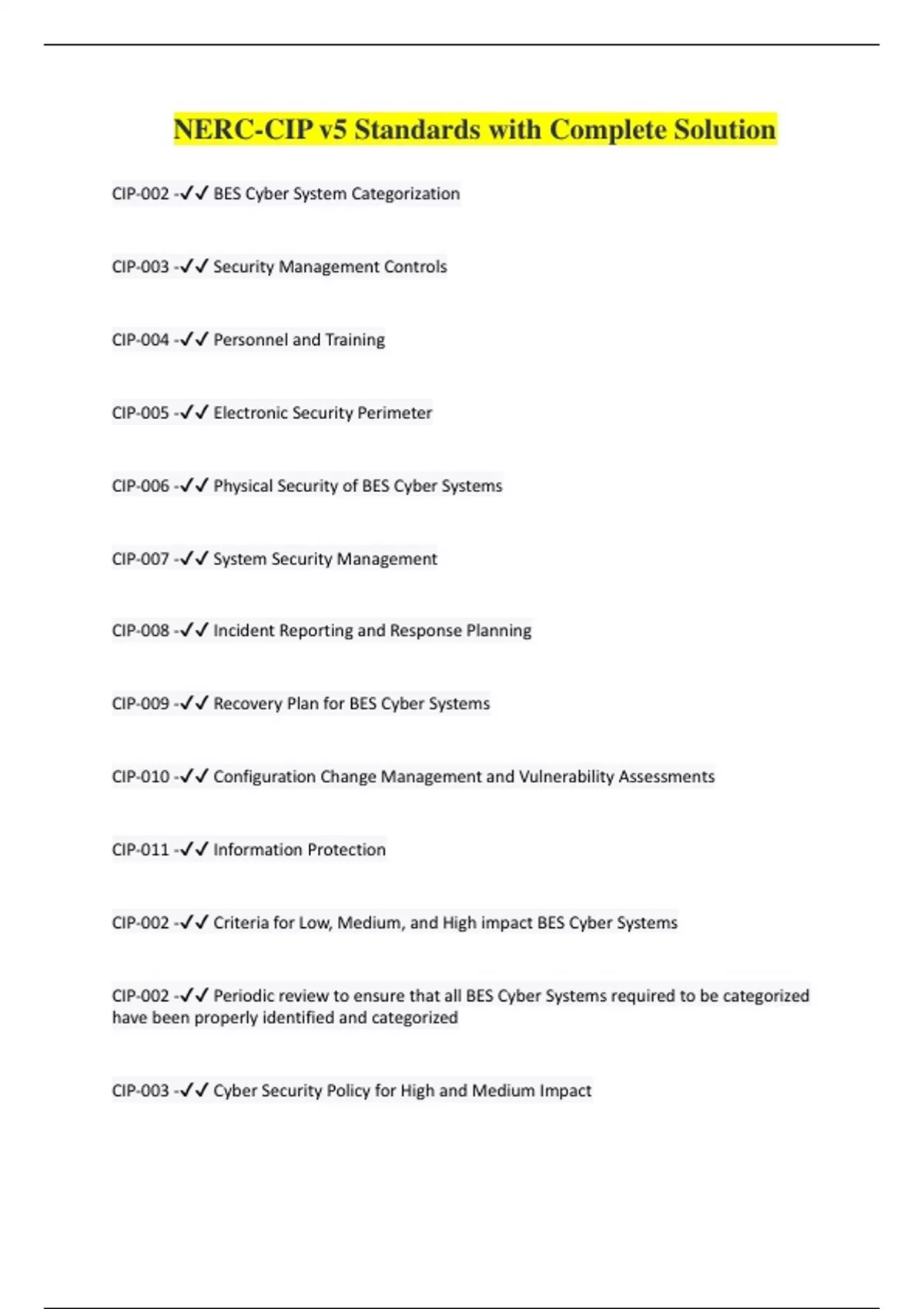 CIP-002 - BES Cyber System Categorization CIP-003 - Security Management Controls CIP-004 - Personnel and Training CIP-005 - Electronic Security Perimeter CIP-006 - Physical Security of BES Cyber Systems CIP-007 - System Security Management CIP-008 - Incident Reporting and Response Planning CIP-009 - Recovery Plan for BES Cyber Systems